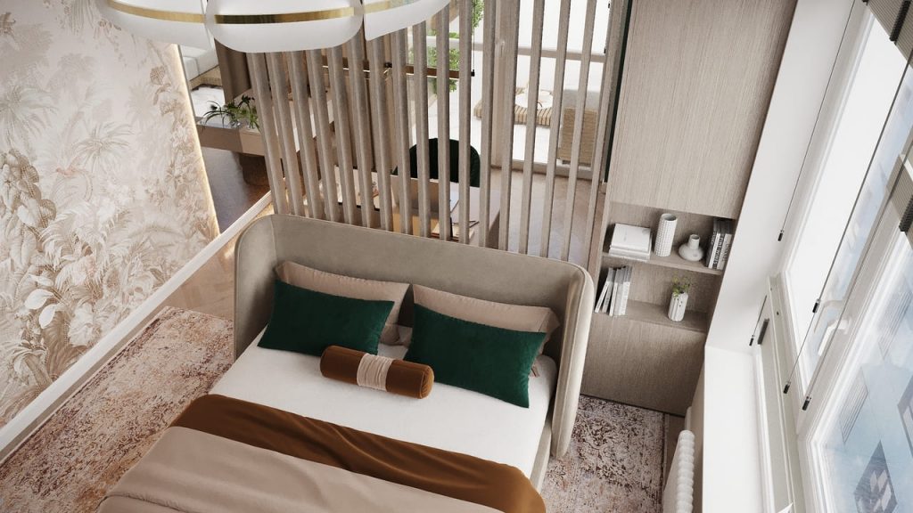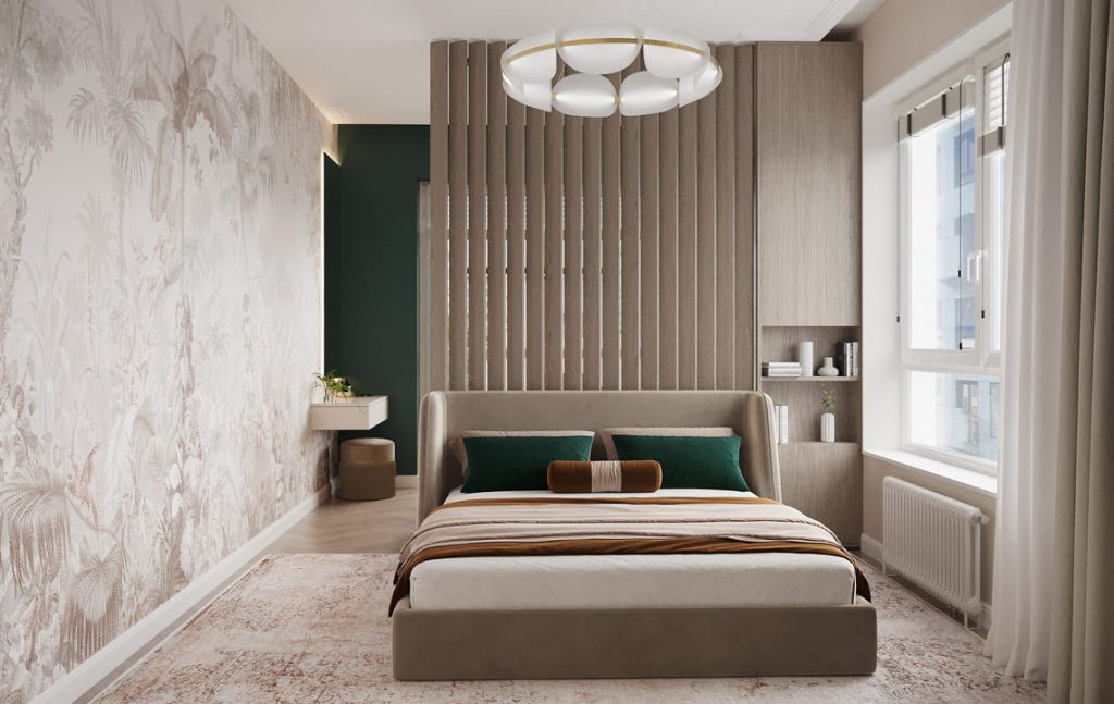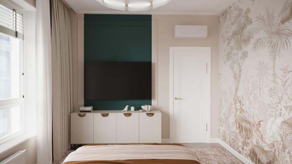 Кровать с мягким изголовьем, декоративные подушки и тёплый текстиль создают атмосферу отдыха. Окно наполняет комнату естественным светом, а плотные шторы позволяют легко затемнить пространство при необходимости. Телевизионная зона оформлена на фоне изумрудного акцента, а тумба с золотистыми ручками придаёт интерьеру нотку ар-деко.