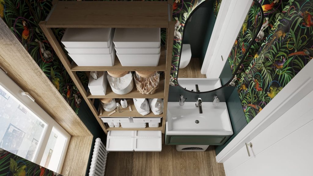 Цветовая палитра построена на глубоком тёмно-зелёном фоне и обоях с тропическим принтом, которые мгновенно притягивают взгляд. Такой декоративный ход превращает даже утилитарное помещение в яркий интерьерный акцент квартиры. Потолок и двери — белоснежные, а пол выполнен в тёплом древесном тоне, что добавляет уюта и визуального баланса.