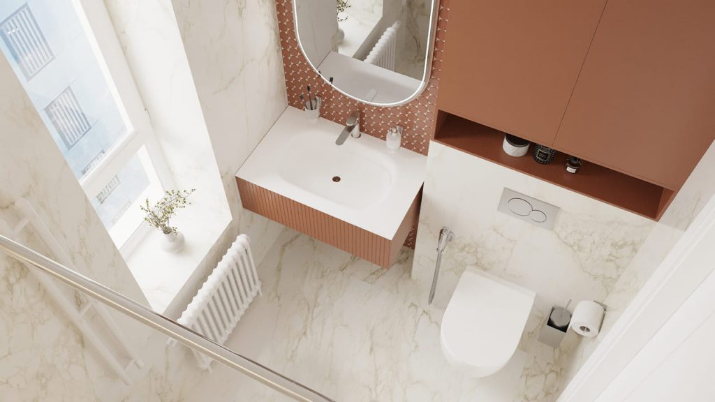 В нише над инсталляцией — встроенный шкаф для хранения, выполненный в том же тёплом оттенке. Такое решение помогает скрыть бытовые мелочи и при этом сохранить стильную геометрию интерьера.