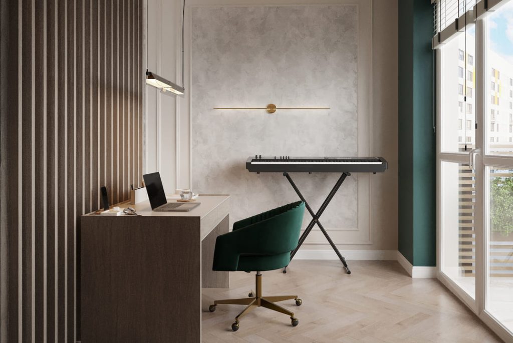 Рабочее место интегрировано максимально эргономично: лаконичный стол, удобное кресло, подвесной светильник и встроенный шкаф-гардероб с прозрачными фасадами. Здесь можно с комфортом работать, заниматься творчеством или погрузиться в любимое хобби — даже место под музыкальный инструмент нашлось!