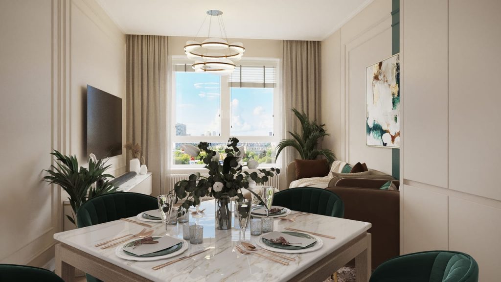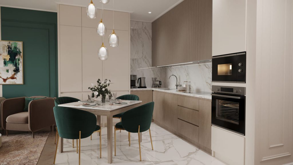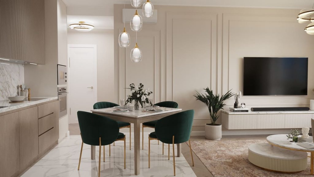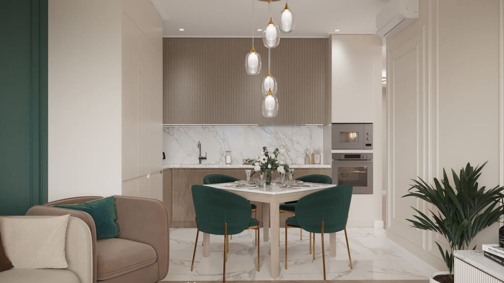 Обеденная зона объединяет пространство и создаёт мягкий переход между кухней и гостиной. Изумрудные стулья с золотыми ножками поддерживают общую цветовую концепцию, а каскад стеклянных светильников добавляет лёгкости и динамики.