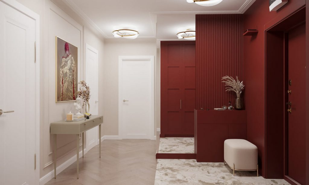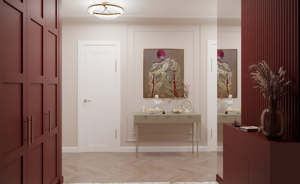 Прихожая выполнена в современном классическом стиле с ярким цветовым акцентом: глубокий терракотово-красный обрамляет входную зону, создавая эффектную рамку и моментально задавая настроение всему интерьеру. Этот насыщенный цвет выделяет зону прихожей на фоне нейтральной бежево-белой палитры остальной квартиры.