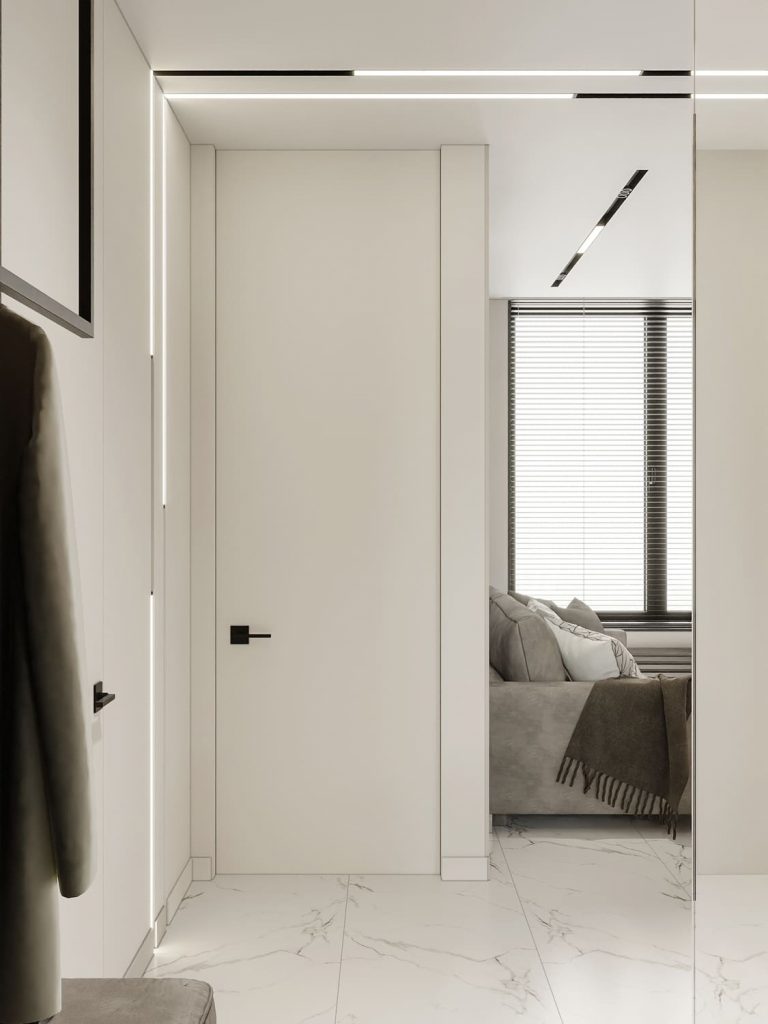 Прихожая — это пространство, где функциональность и эстетика идут рука об руку. Светлая палитра стен и напольная плитка под мрамор визуально расширяют пространство, создавая ощущение лёгкости и порядка. А встроенная подсветка по потолку и торцам стен не только добавляет уюта, но и помогает мягко ориентироваться в пространстве даже ночью.