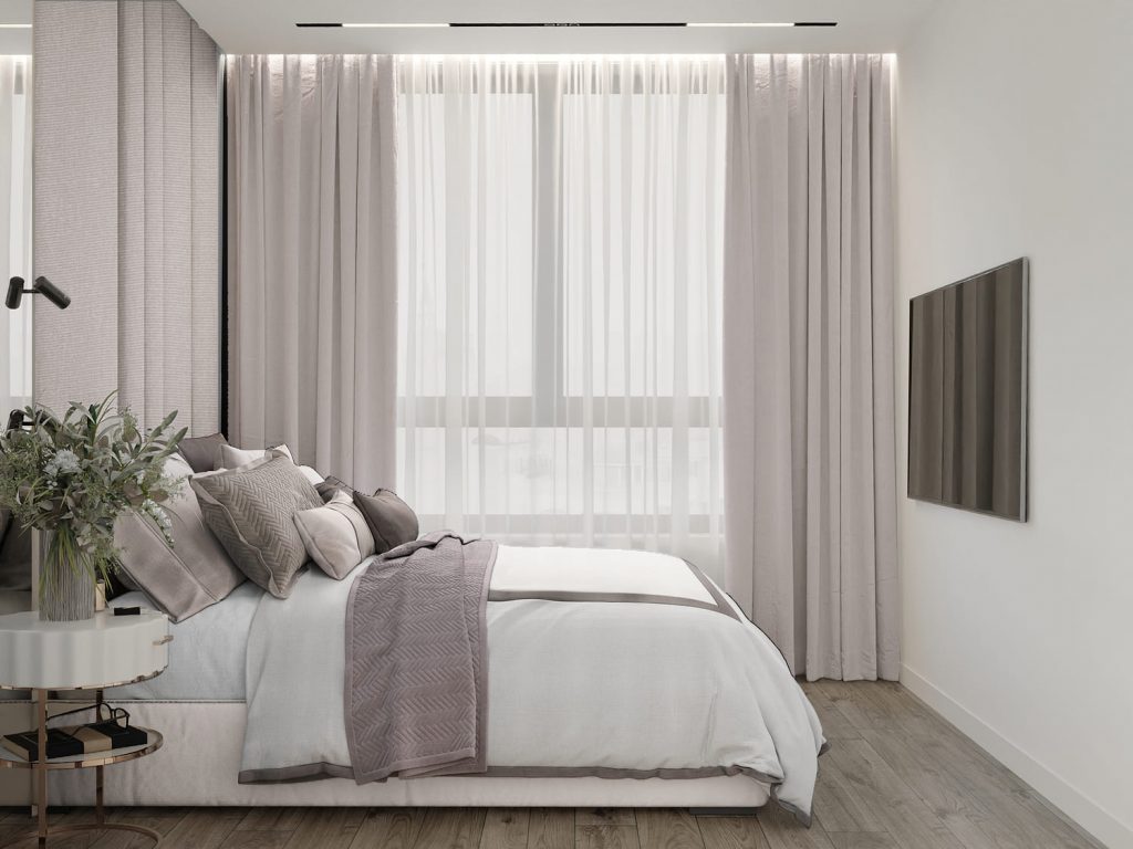Слева от кровати — лаконичный туалетный столик и живые цветы, как маленький уголок красоты и уюта. Справа — высокий оконный проём, скрытый за лёгкими шторами и портьерами в тон стенам. Это даёт максимум света днём и полную приватность вечером.