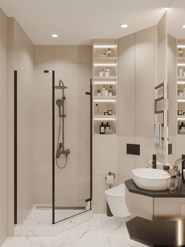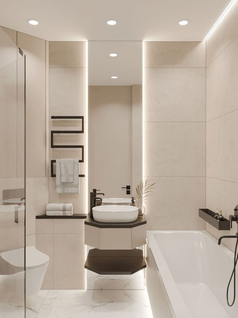 Отдельное внимание — встроенным нишам и открытым полкам с подсветкой: здесь нашлось место и для уходовой косметики, и для небольшого декора, который добавляет уюта. Даже полотенцесушитель — не просто техника, а стильный графичный элемент.