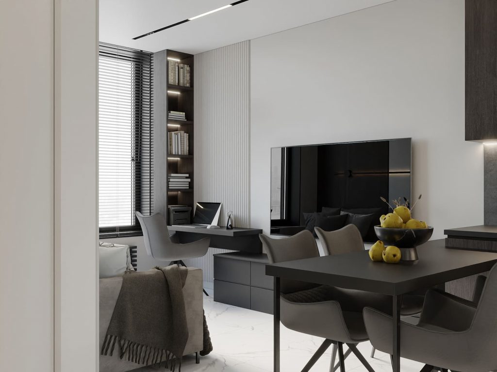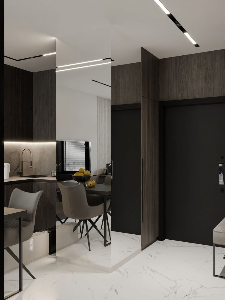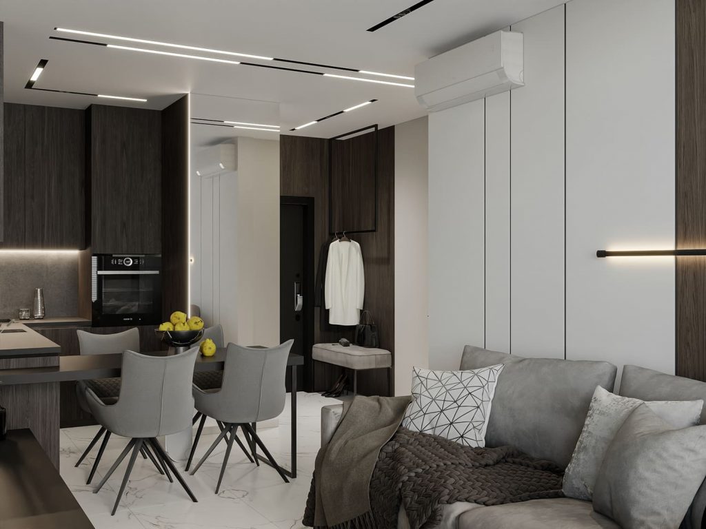 Квартира в спокойных оттенках: светлая отделка, глубокий графит и теплая древесина