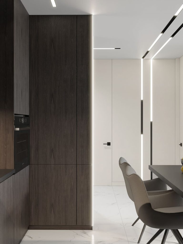 Особое внимание — шкафу, который стал продолжением кухонного гарнитура. Такое решение позволило отказаться от традиционных перегородок и эффективно использовать каждый сантиметр. Благодаря этому прихожая плавно перетекает в обеденную зону, сохраняя при этом чёткую функциональную границу.