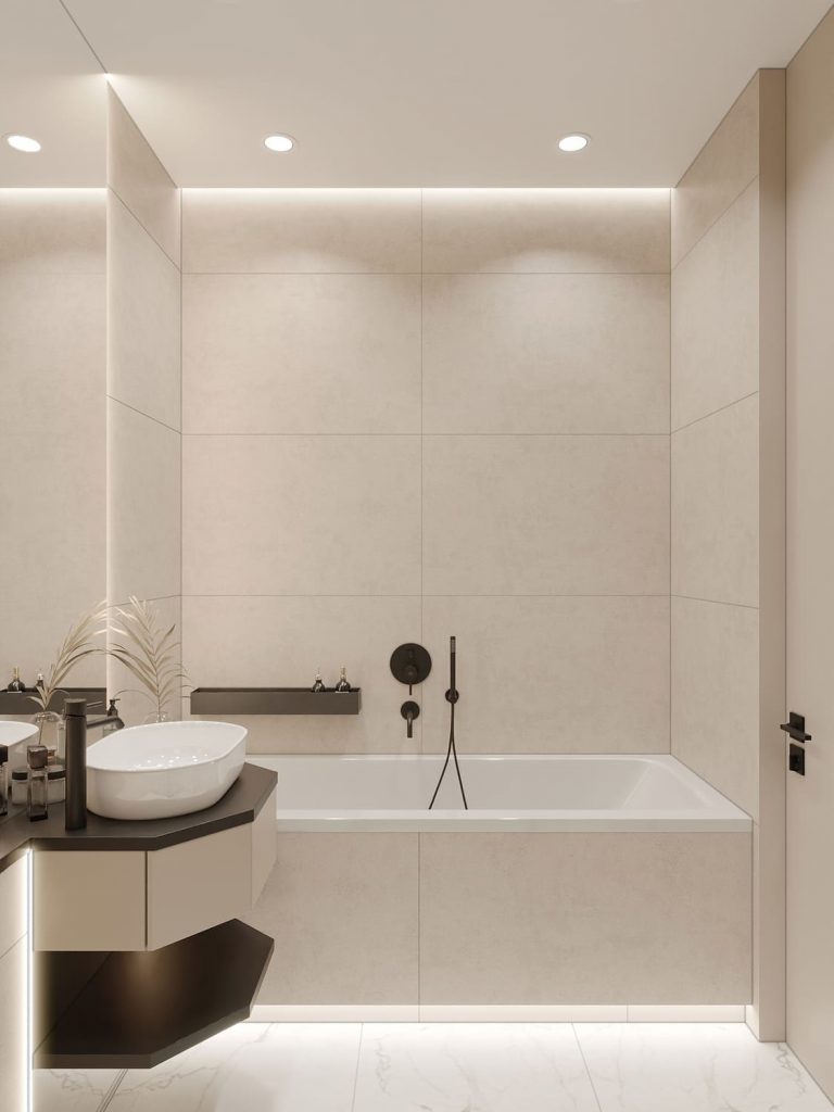 Душевая кабина с чёрным контуром выглядит стильно и современно, а за счёт прозрачных стен не «съедает» пространство. Вторая зона — полноценная ванна, где можно спокойно расслабиться в конце дня. Подсветка вдоль потолка и под ванной создаёт мягкое свечение, визуально приподнимая интерьер и добавляя ощущение лёгкости.