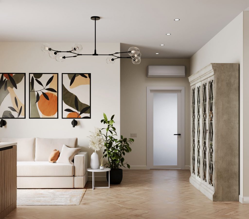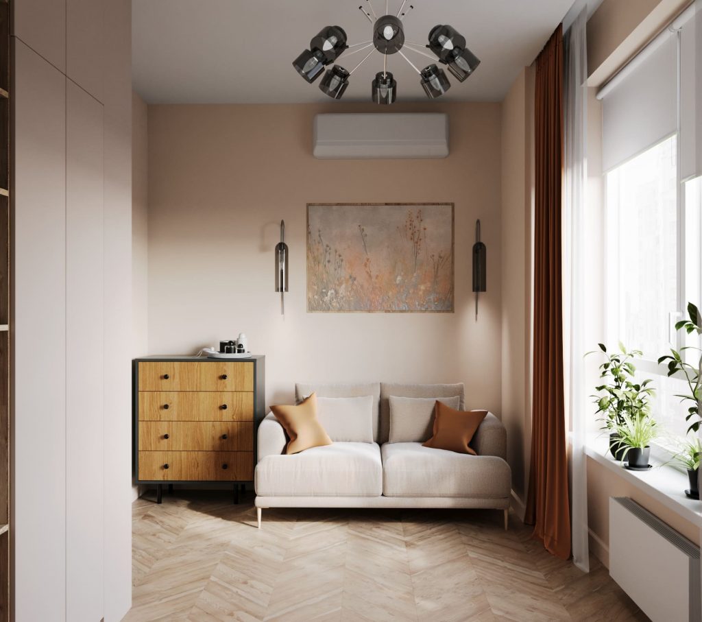 Вторая часть комнаты — зона отдыха. Здесь стоит мягкий диван с тёплыми подушками и стильная винтажная тумба с деревянными фасадами. Над диваном — картина с полевыми цветами в нежных тонах, отсылающая к природе и создающая расслабляющее настроение. Современные бра с вытянутыми плафонами добавляют вертикали и элегантности.