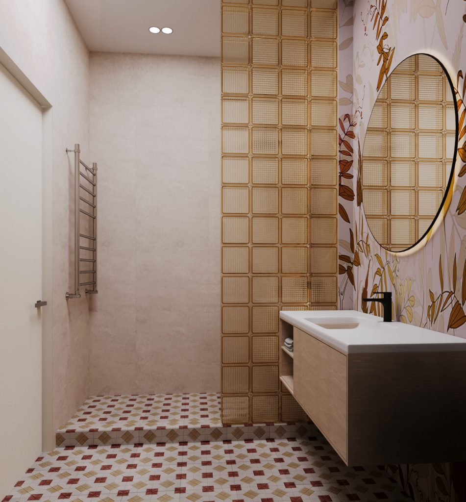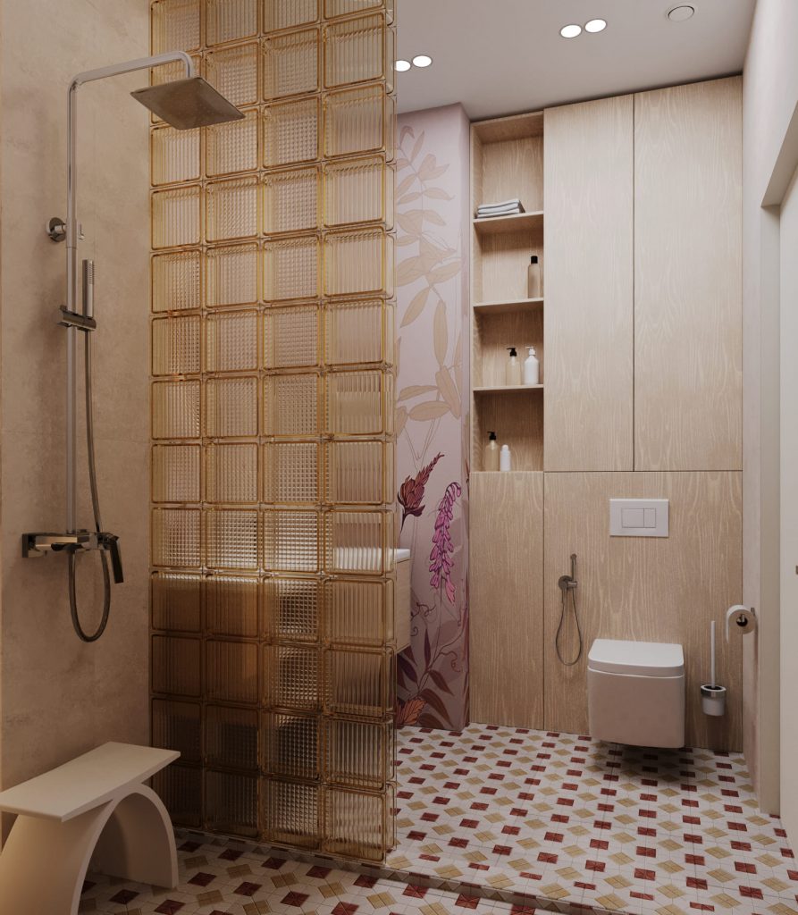 Зонирование душа выполнено при помощи стеклоблочной перегородки медового цвета — нестандартное, но очень эффектное решение.