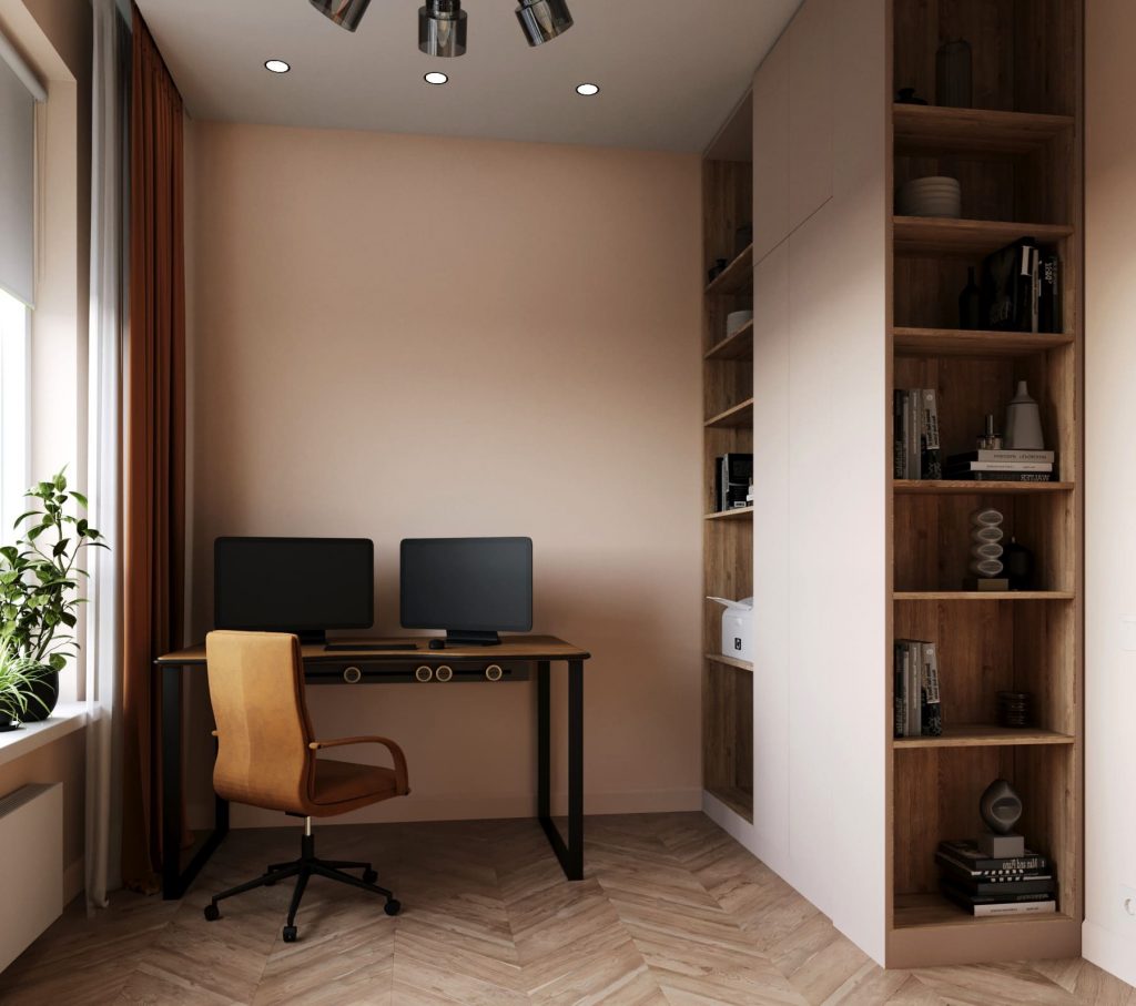 Основу интерьера составляют светлые и тёплые тона, перекликающиеся с остальной палитрой квартиры. Бежево-песочные стены создают нейтральный фон, на котором ярче читаются мебель и детали. Рабочая зона оформлена лаконичным столом с чёрным металлокаркасом и удобным кожаным креслом в карамельном оттенке. Два монитора говорят о серьёзном подходе к делу — здесь комфортно и работать, и заниматься творчеством.