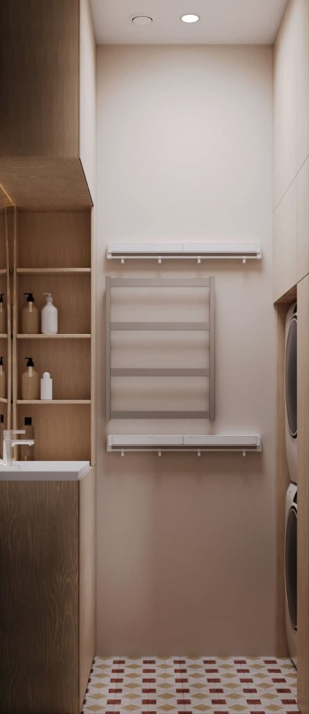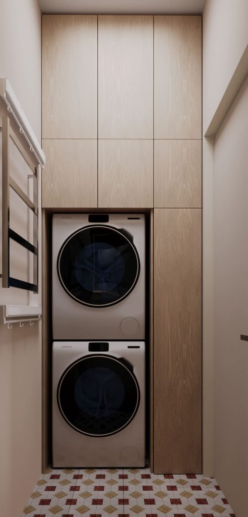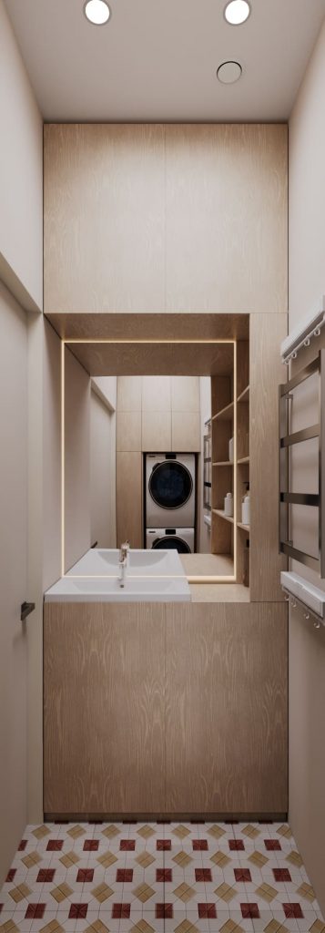 Главная особенность — это рациональная организация: стиральная и сушильная машины встроены в нишу, сверху — вместительные шкафы для хранения бытовой химии, белья и прочих нужных мелочей. Всё спрятано за фасадами в отделке под светлое дерево, что делает зону визуально цельной и спокойной.