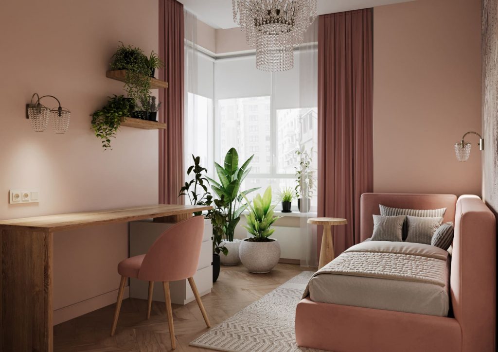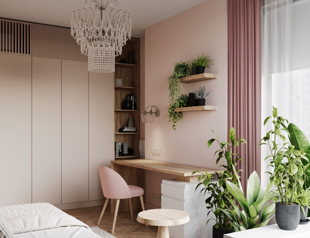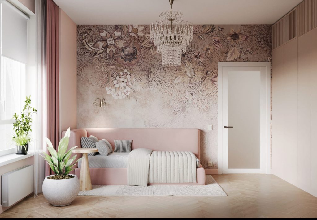 В основе — пудрово-розовая палитра, которая задаёт мягкое, обволакивающее настроение. Центром композиции стала эффектная акцентная стена с этническим флористическим узором, выполненным в пастельных, сложных оттенках. Этот орнамент — словно сказка на стене: каждый раз можно открывать для себя новые детали. Элегантная хрустальная люстра добавляет нотку гламура и делает интерьер более утончённым.