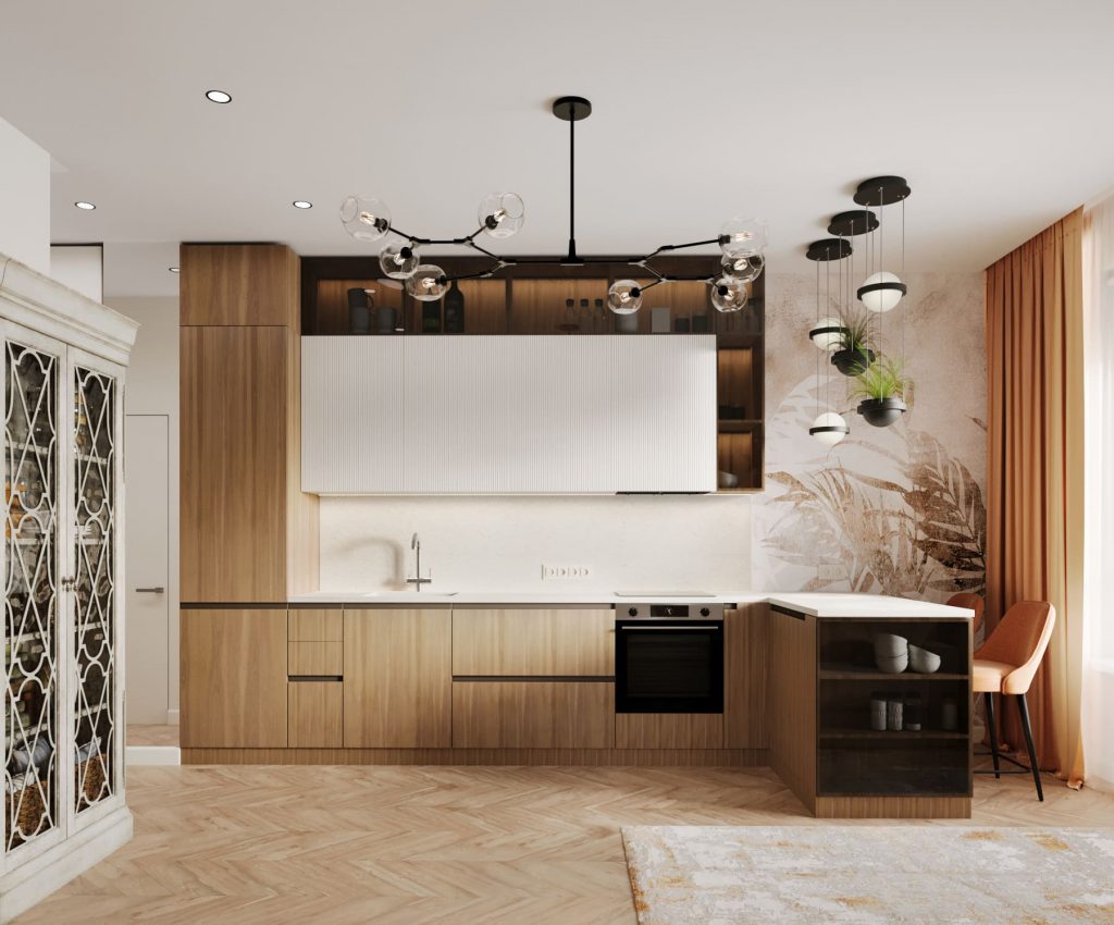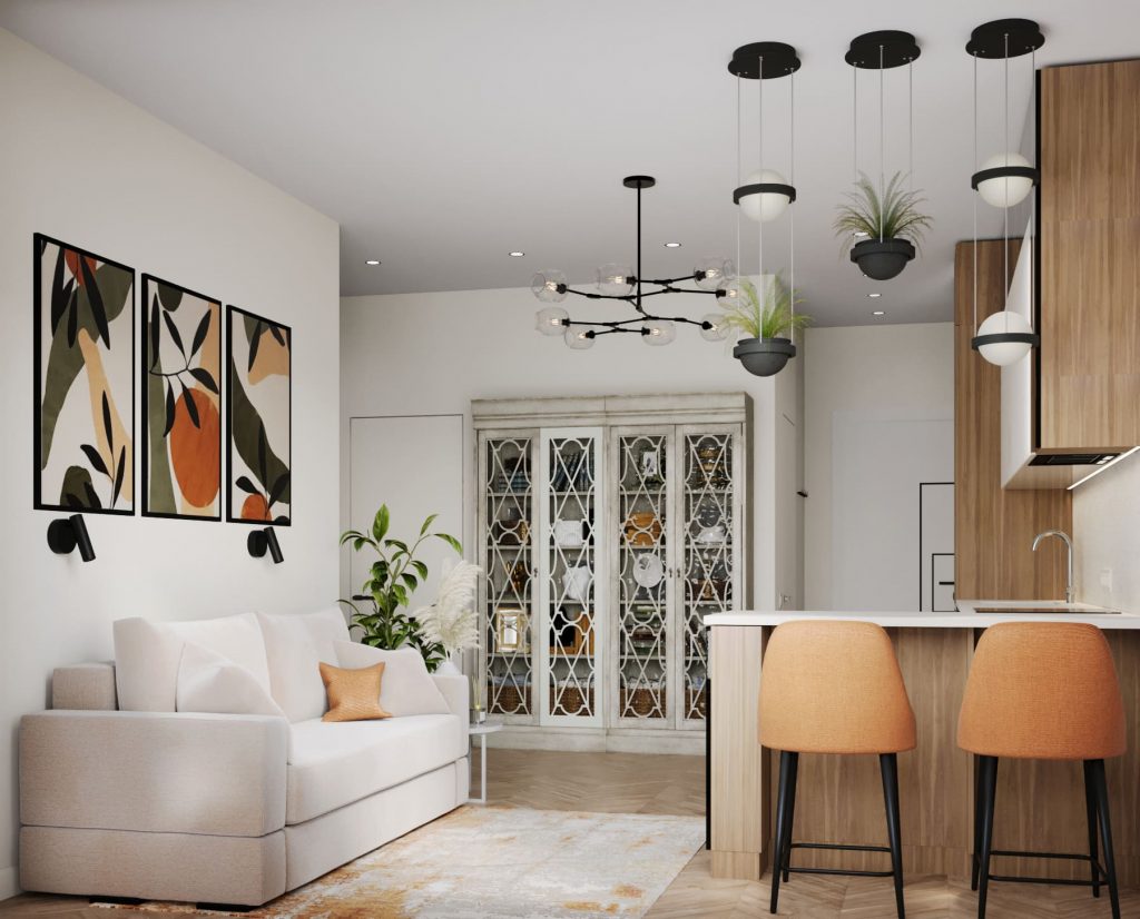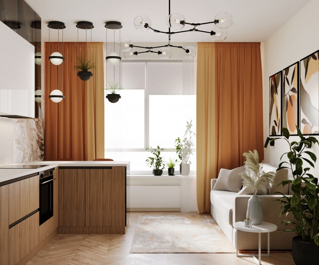 Цветовая палитра построена на тёплых, природных тонах: дерево, мягкий беж и акценты насыщенного оранжевого — в шторах, барных стульях и подушках. Благодаря такой гамме даже в пасмурный день пространство выглядит тёплым и наполненным жизнью.