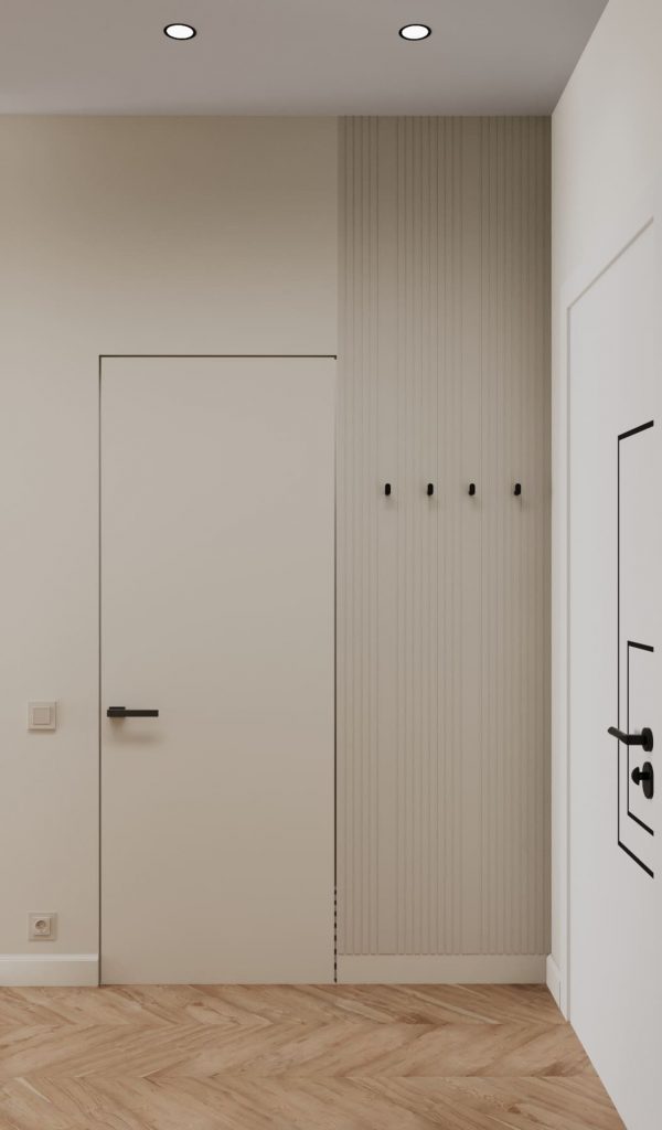 Встроенный шкаф с отделкой «под дерево» решает вопрос хранения и перекликается с кухонными фасадами, создавая ощущение цельного пространства. Потайная дверь в одной из стен почти сливается с отделкой, не перегружая интерьер. Настенные чёрные крючки на рельефной панели — ещё один пример продуманного дизайна: удобно, практично, эстетично.