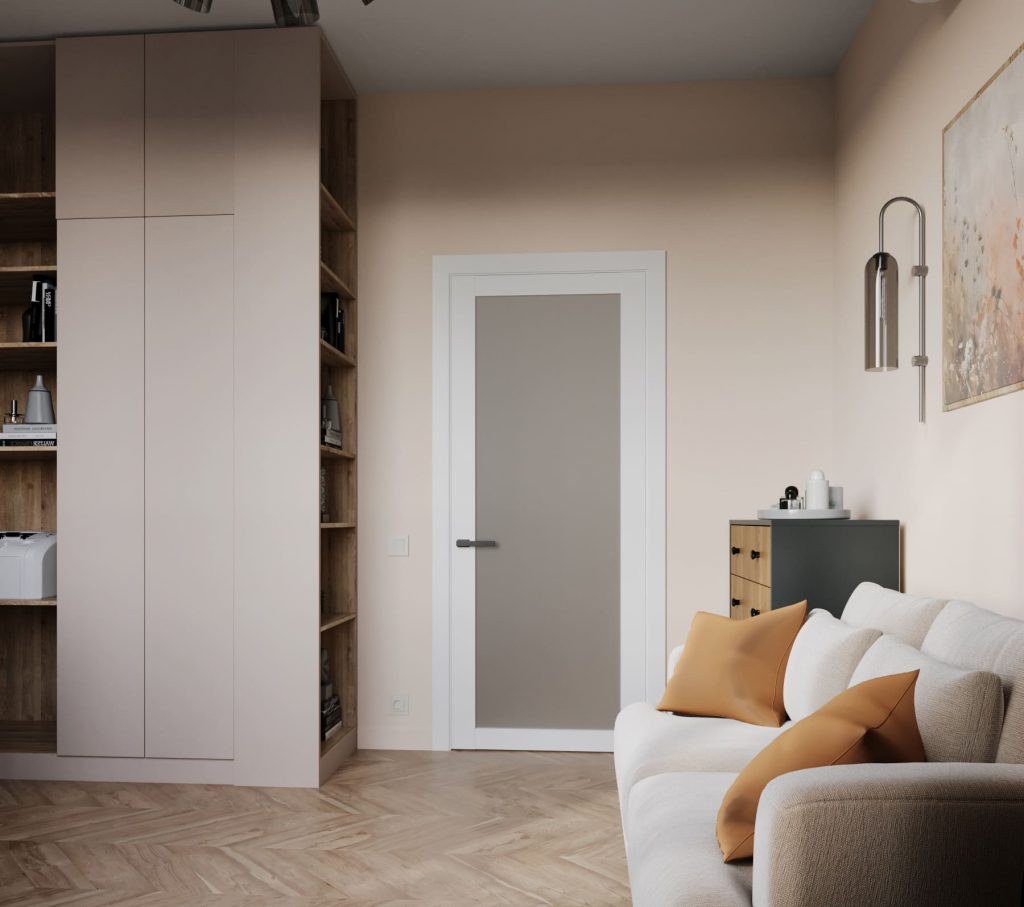 Встроенный шкаф со сдержанными фасадами аккуратно встроен в общее цветовое решение, не перегружая интерьер.