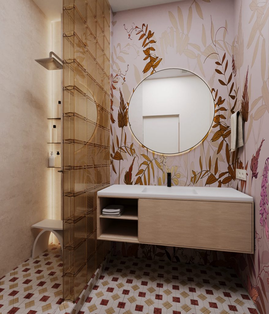 Пол выложен плиткой с узором в тёплой цветовой гамме — ритмичный геометрический орнамент делает интерьер ещё интереснее и немного «восточным» по настроению. В этой ванной нет скучных решений: даже встроенные шкафы для хранения и инсталляция оформлены в светлом дереве и органично вписываются в общую композицию.