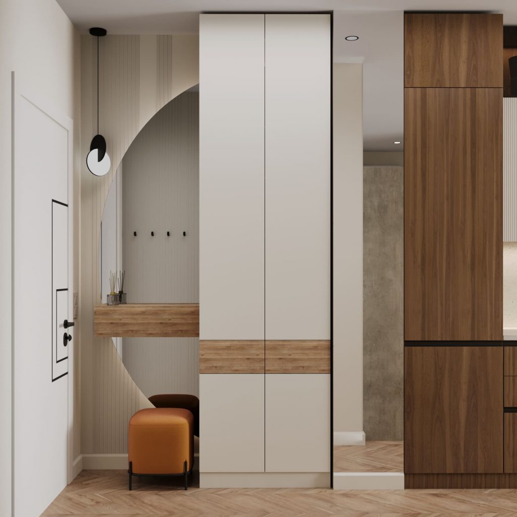 Главную роль здесь играют мягкие бежевые и древесные оттенки, которые создают ощущение уюта и визуального солнца даже в пасмурный день. Акцентная зона с большой круглой зеркальной вставкой делает пространство глубже, а подвесной светильник добавляет изюминку — стильный и немного игривый штрих. Под консолью разместился мягкий пуф сочного оранжевого цвета — первый привет от любви хозяйки к ярким деталям.