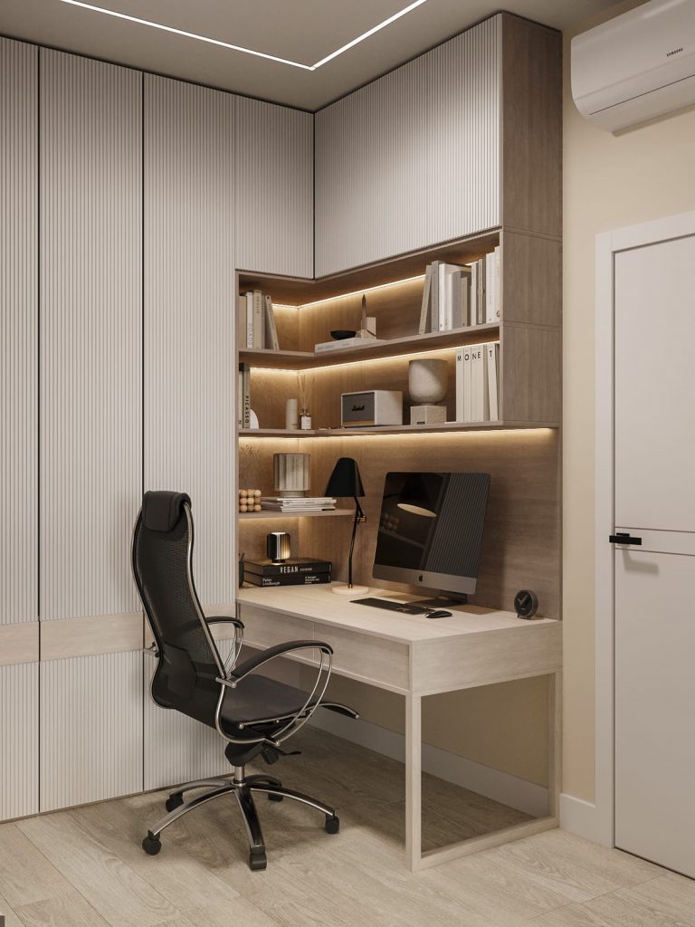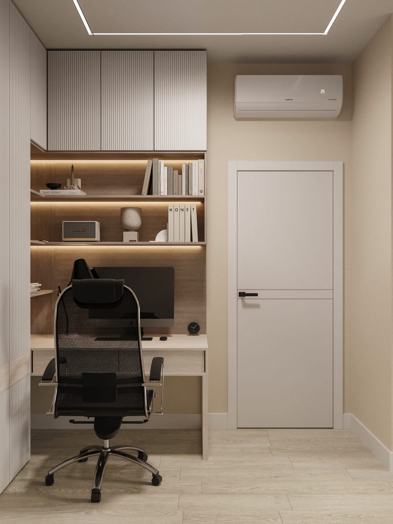 Особенность этого помещения — рабочая зона, уместившаяся в нише рядом со спальным местом. Она скрыта от основного обзора, но при этом полностью функциональна: есть и удобный стол, и полки с подсветкой, и система хранения. Такое решение идеально для семьи, где нужно организовать домашний офис, но при этом сохранить целостность интерьера.