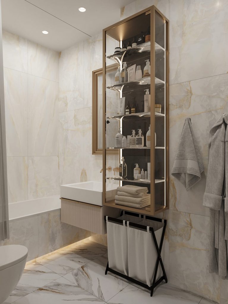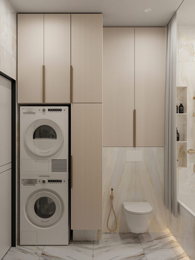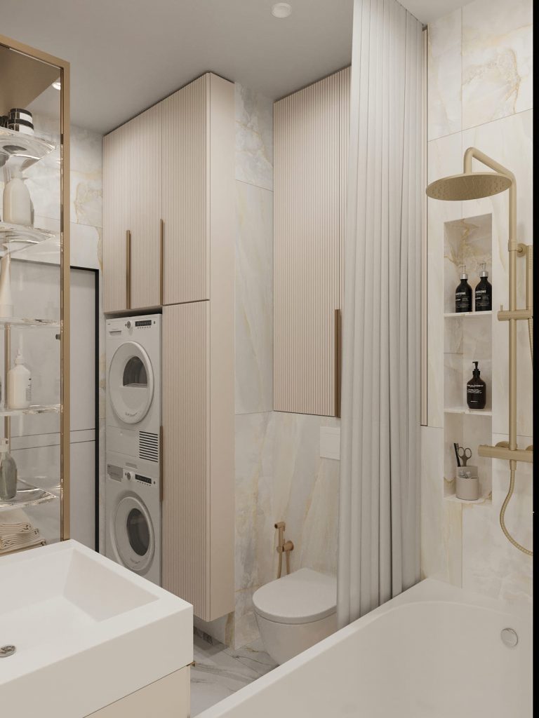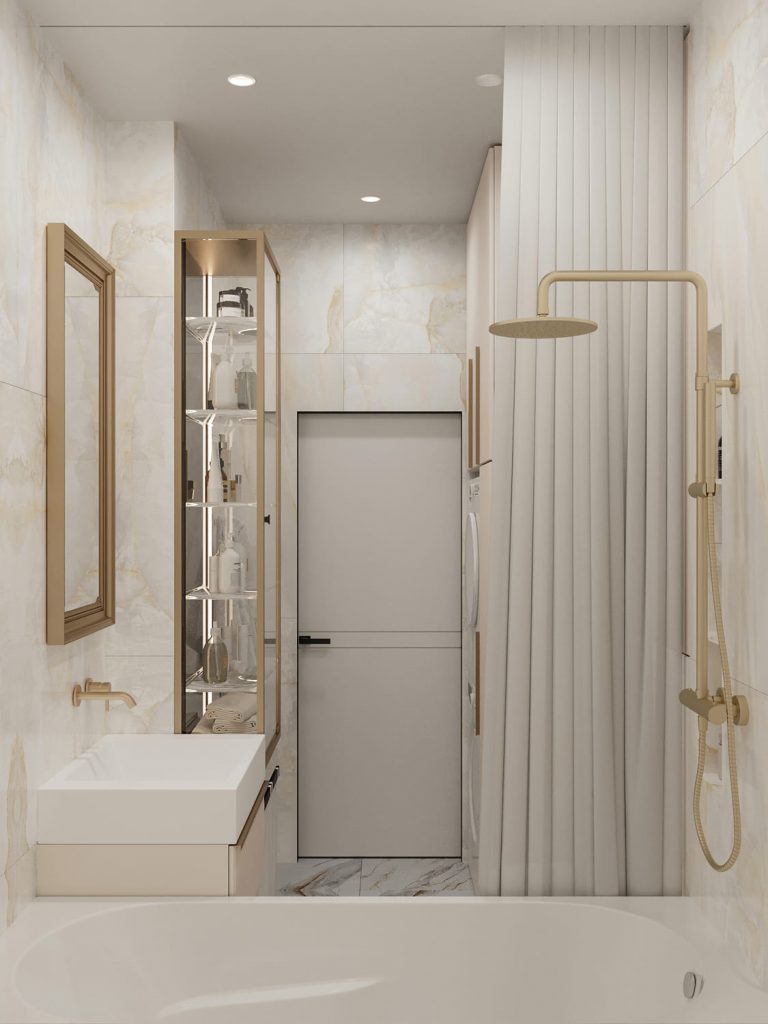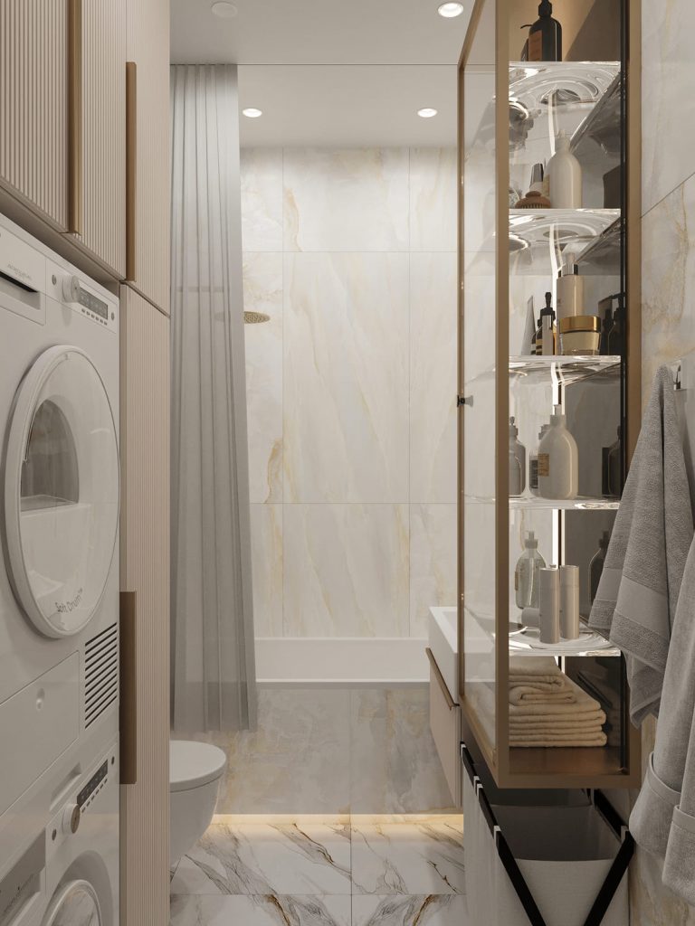 Эта ванная комната оформлена в светлых тонах с мраморной текстурой плитки. Здесь предусмотрено всё необходимое: ванна с душем, подвесной умывальник с зеркалом и подсветкой, закрытые и открытые системы хранения, зона с колонкой стиральной и сушильной машин. Много встроенных шкафов и ниша с полками позволяют удобно хранить бытовые принадлежности. Акценты — золотистая сантехника и профили на стеклянной полке, создающие ощущение элегантности.