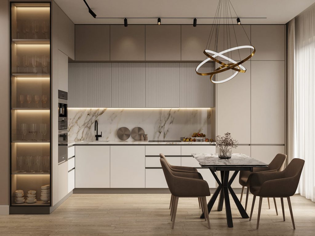 Благодаря мраморному фартуку с выразительным рисунком кухня выглядит нарядно, но не перегружено. Фасады выполнены в спокойных, бежевых тонах, что визуально расширяет пространство. Рифлёная поверхность в верхней части добавляет текстуры и ритма, а встроенная подсветка делает рабочую зону комфортной в любое время суток.
