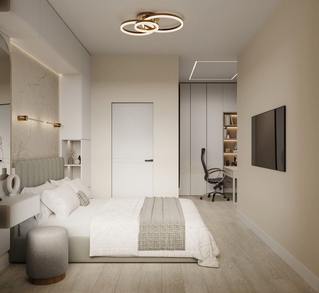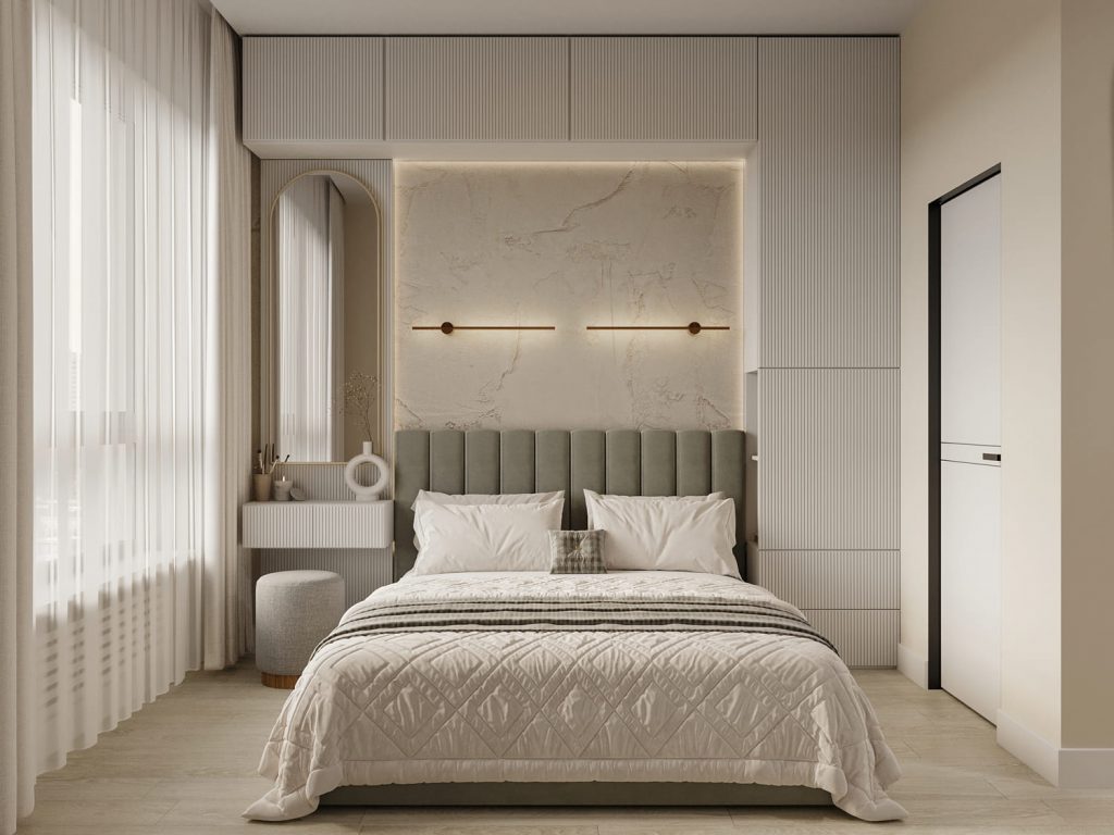 Изголовье кровати оформлено в нежном оливковом оттенке с вертикальной простёжкой — мягкое, уютное и визуально вытягивает пространство вверх. За ним — декоративная панель с подсветкой и встроенными бра, которые заменяют прикроватные светильники. Благодаря симметричной компоновке, комната выглядит собранной и сбалансированной.