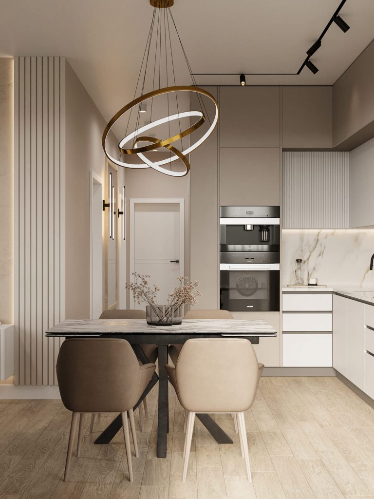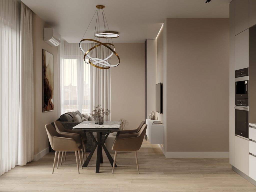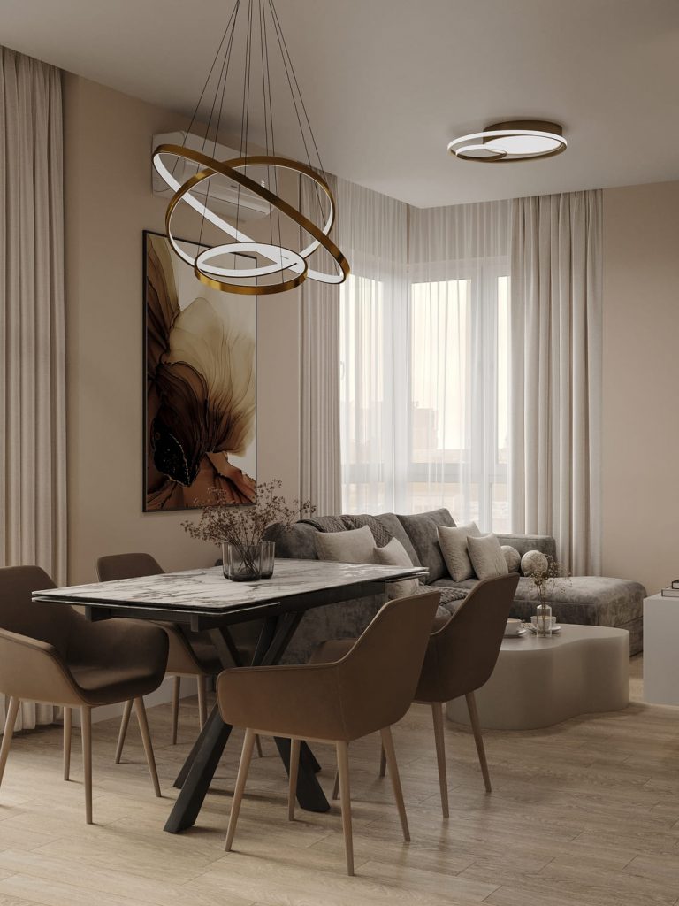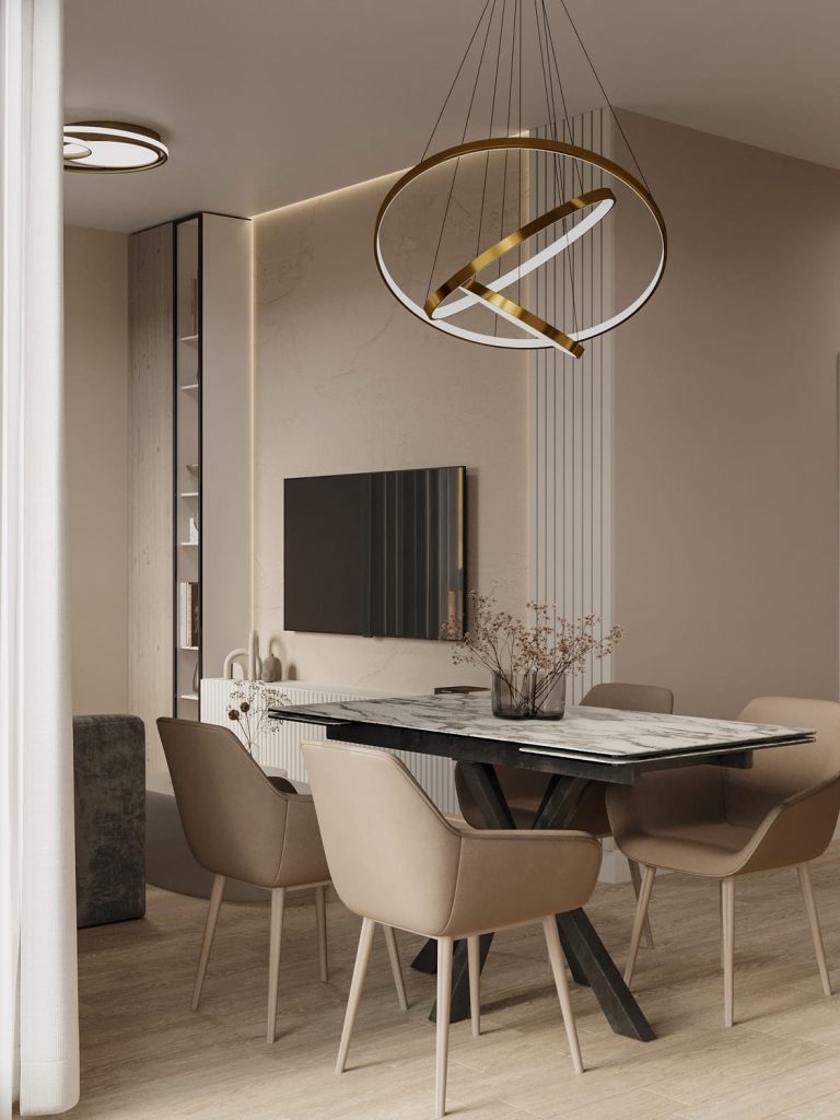 Обеденная зона получилась лаконичной, но выразительной. Мягкие кресла с тонкими ножками поддерживают цветовую палитру квартиры, а стол с чёрным основанием и мраморной столешницей смотрится статусно. Центральный элемент — подвесной светильник с кольцами — добавляет динамики и делает композицию завершённой.