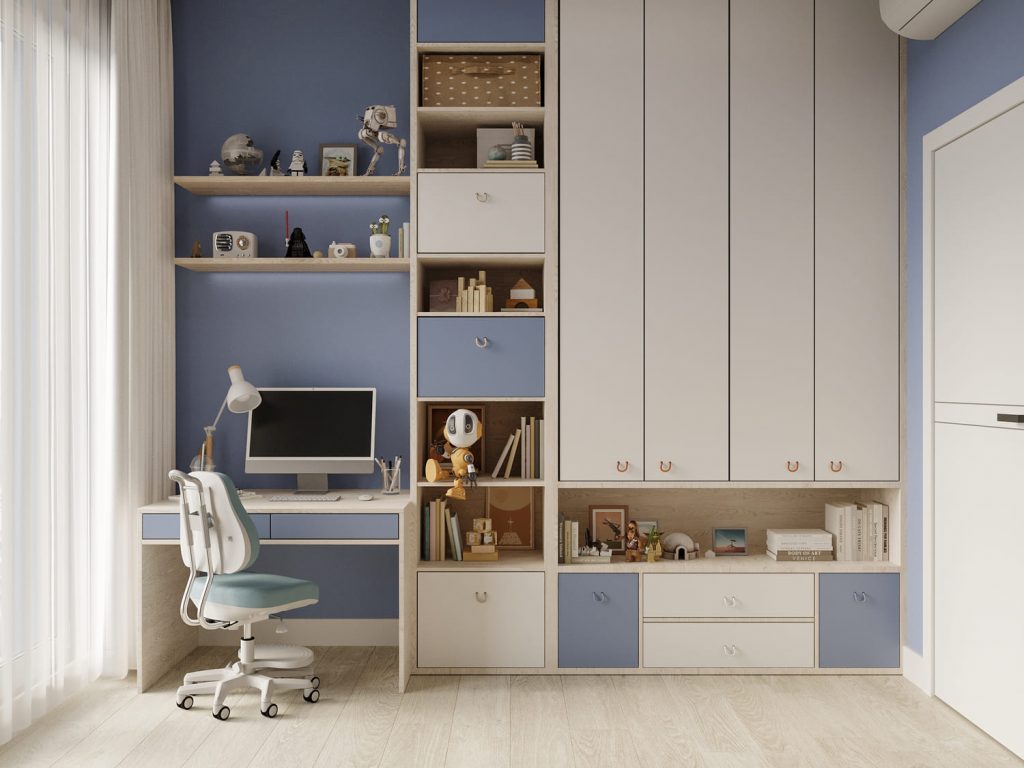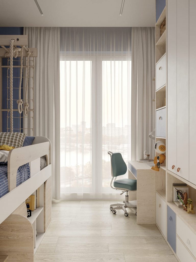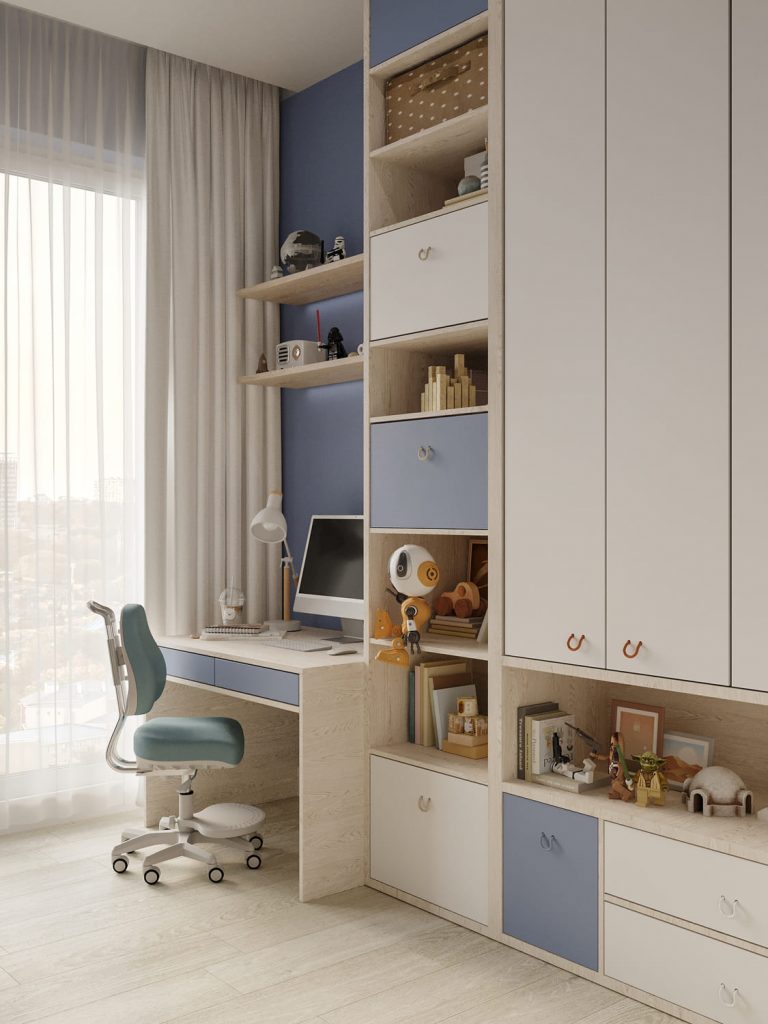 Рабочая зона у окна организована так, чтобы ребёнку было комфортно заниматься при естественном освещении. Стол с выдвижными ящиками, удобное кресло и открытые полки создают идеальное место для занятий. Гардеробная система с яркими акцентами и интересной геометрией фасадов не только функциональна, но и визуально оживляет интерьер.