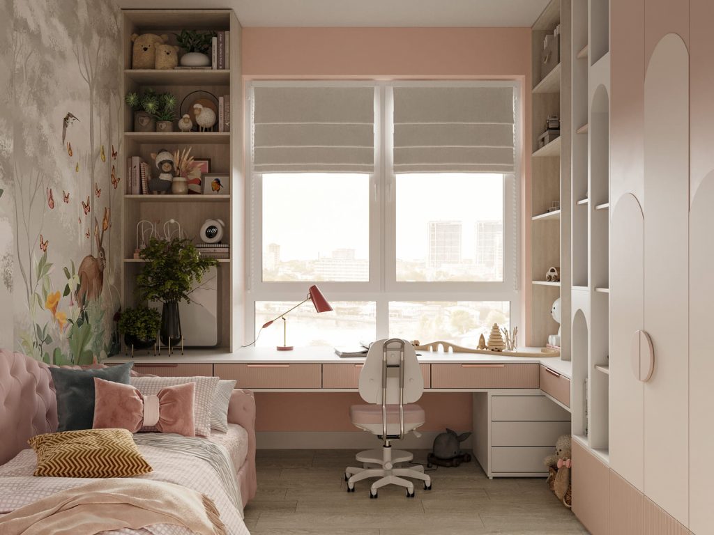 Мягкая кровать с пудрово-розовой обивкой и стёжкой напоминает уютный диван из сказки, а текстиль в мелкую клетку и пастельных оттенках добавляет уюта. Возле окна — большая рабочая зона, которая буквально растекается по стенам: здесь много полок, выдвижных ящиков и встроенных отсеков для хранения. Всё это организовано на детском уровне — чтобы девочка могла легко доставать книги, игрушки и канцтовары.