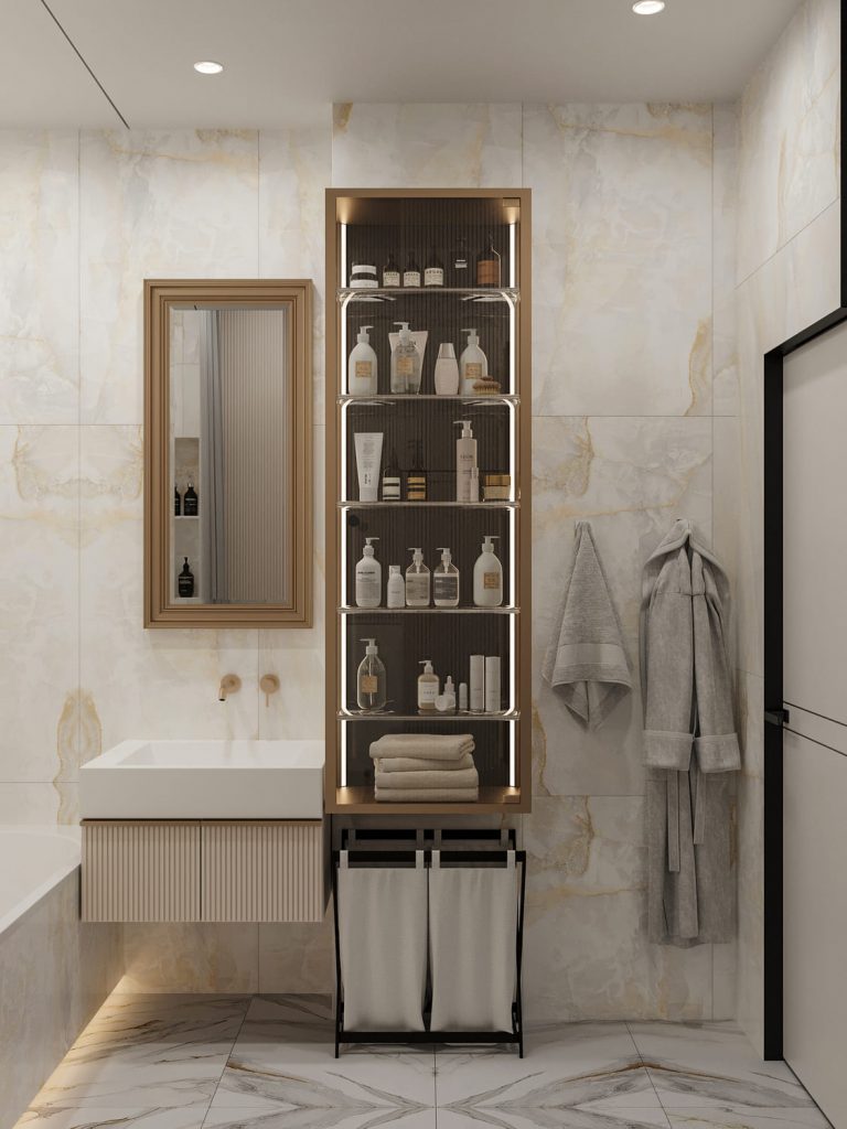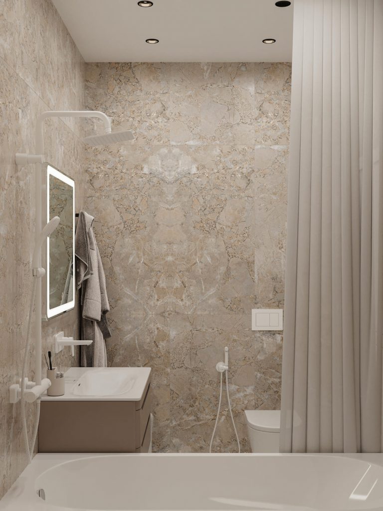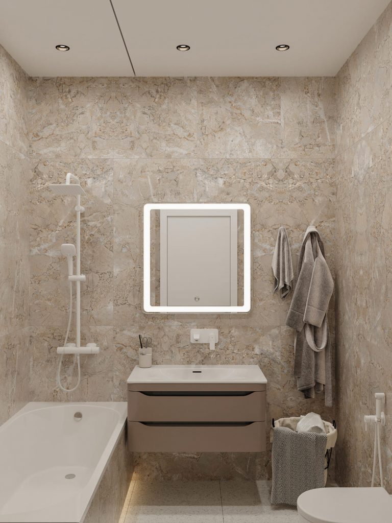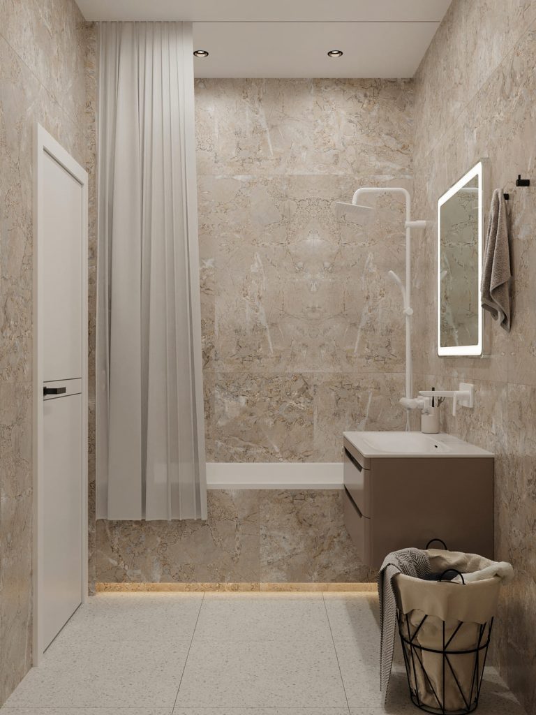 Вторая ванная комната выполнена в более тёплой и уютной гамме с текстурой натурального камня. Ванна, душ и умывальник с подсветкой оформлены лаконично, с преобладанием светлых и пудровых оттенков. Напольная плитка с микротерраццо создаёт мягкий контраст. Слева от зеркала — крючки для полотенец, справа — скрытая ниша для хранения косметики. Интерьер создаёт расслабляющую атмосферу и отлично подходит для ежедневного использования.