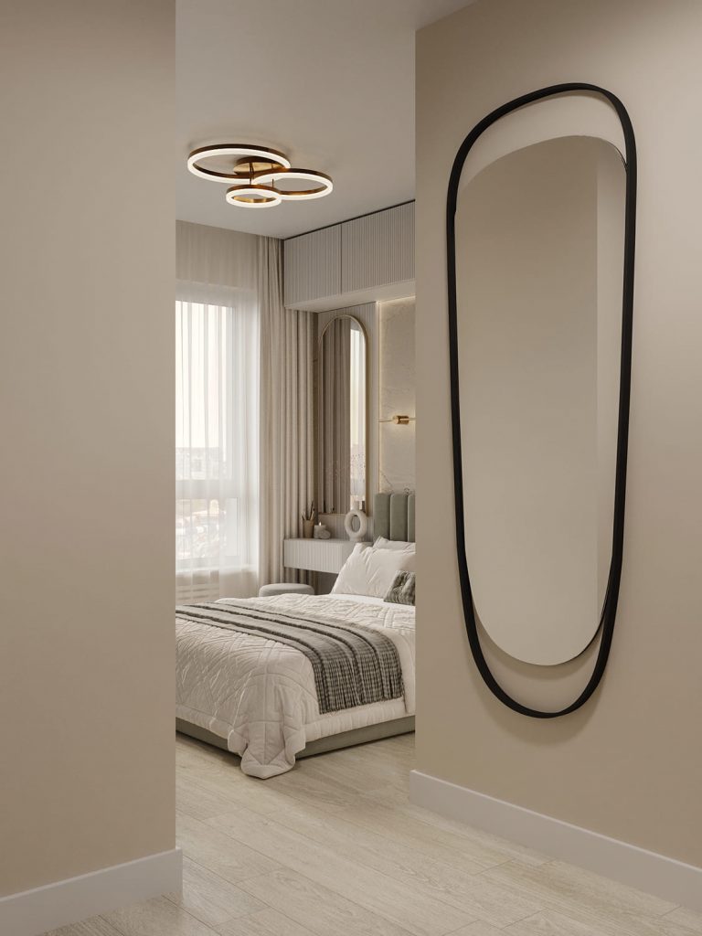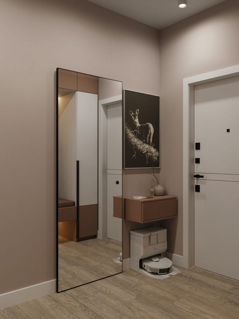 На противоположной стене — большое зеркало в полный рост и небольшая полочка под ключи и мелочи. Внизу — продуманная ниша для робота-пылесоса. Даже в такой простой зоне всё на своих местах — благодаря технической точности и грамотному планированию.