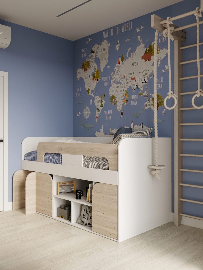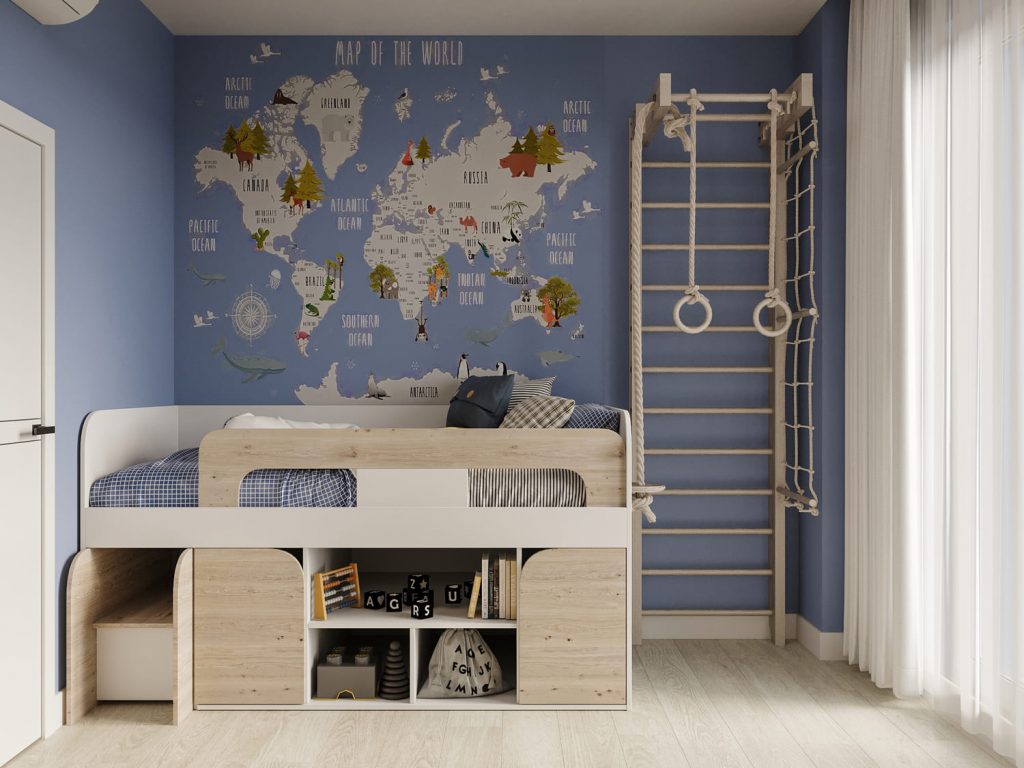 Синий цвет стен задаёт спокойный, но бодрый фон, а карта мира с животными превращает одну из стен в увлекательное обучающее панно. Здесь всё продумано, чтобы ребёнку было удобно играть, учиться и отдыхать.