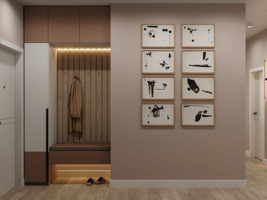 Слева от входа — компактная, но очень продуманная зона хранения. Закрытые шкафы уходят вверх до потолка, позволяя использовать всё пространство. В нише — мягкая скамья, рифлёная панель и теплое подсветка: здесь удобно переобуться и повесить верхнюю одежду. Светлые бежевые стены и фасады визуально расширяют пространство, а тёмные акценты — ручки, нижние секции — добавляют графичности.
