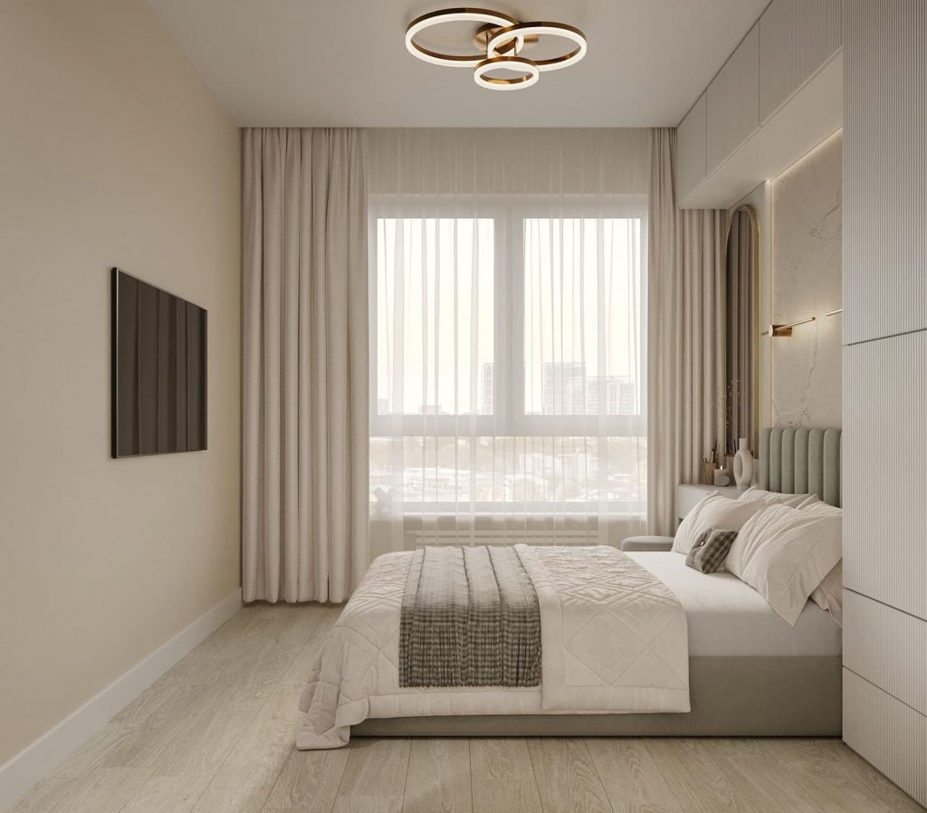 Мягкие бежевые стены, тёплое напольное покрытие под дерево, полупрозрачные шторы и минимализм в декоре делают эту спальню универсальной: в ней легко расслабиться после дня с детьми, поработать в тишине или просто провести ленивое утро с чашкой кофе.