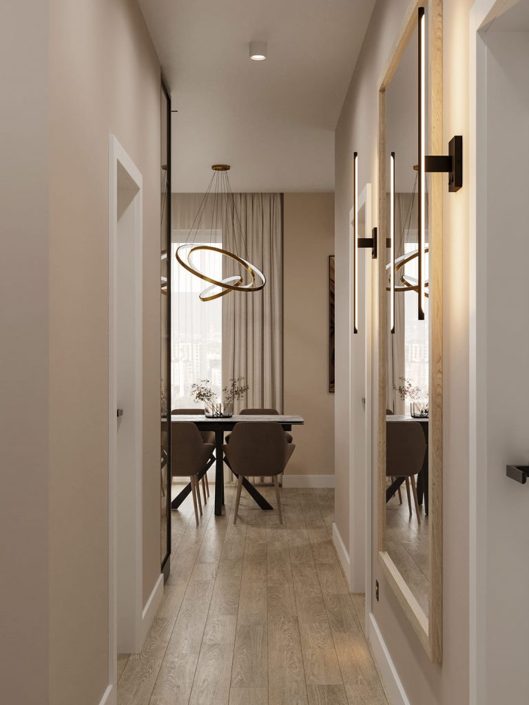 Современная квартира в светлых бежевых тонах с акцентами из дерева и латунных деталей