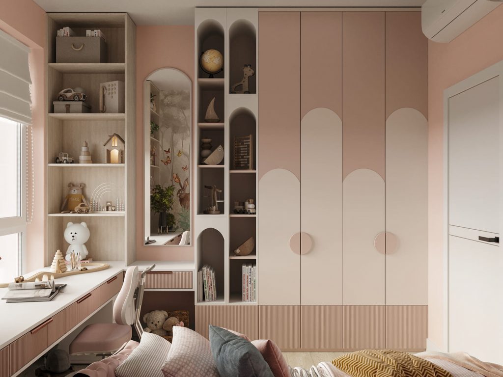 Система хранения оформлена в мягких пудрово-розовых и кремовых тонах, с закруглёнными элементами и декоративными фасадами. Место под окнами занято встроенным столом, у которого достаточно света для занятий даже в пасмурные дни. Рядом — полки для игрушек и декора, а также зеркало в полный рост, которое станет особенно актуальным, когда хозяйка подрастёт.