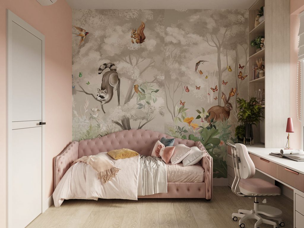 Вдохновением послужил лесной сюжет: на одной из стен раскинулся сказочный лес с белками, бабочками, птицами и енотом — он не только украшает комнату, но и развивает воображение, каждый день рассказывая новую историю.