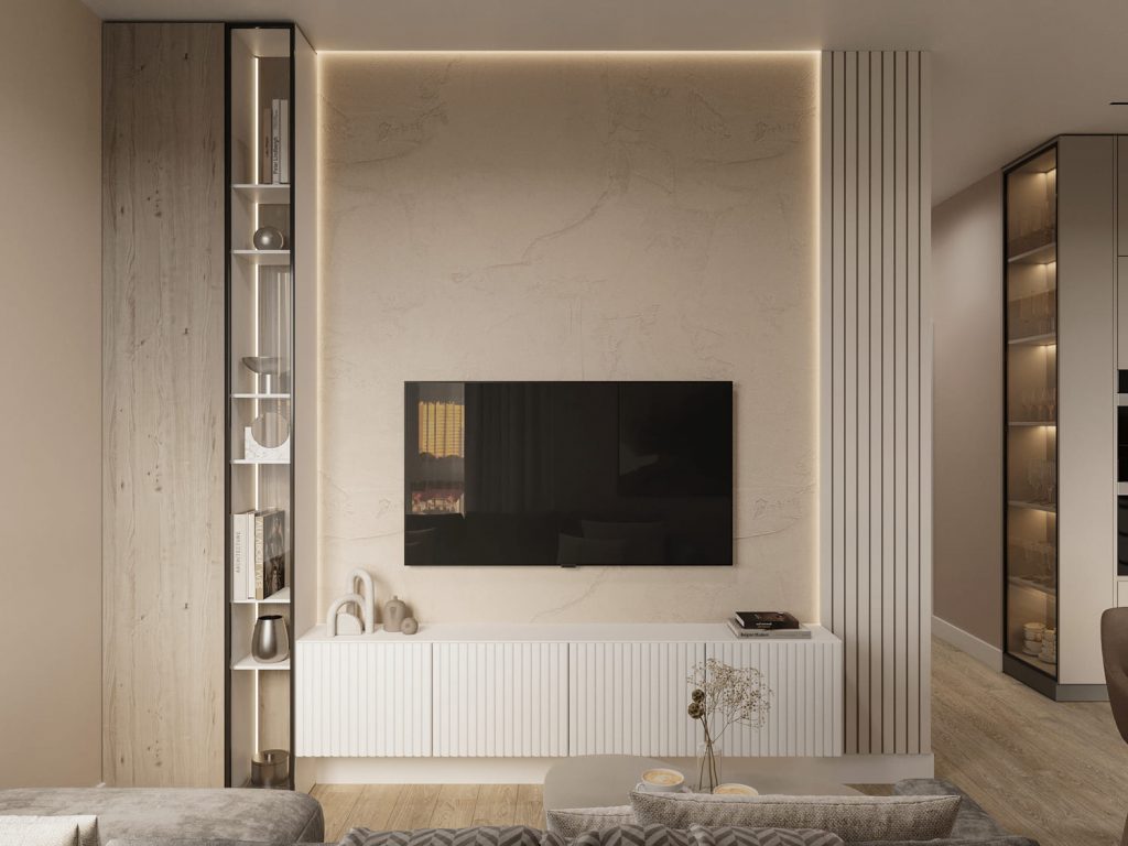 Гостиная плавно перетекает из обеденной зоны, не дробя пространство. Уютный диван у окна, лёгкий кофейный столик и лаконичная ТВ-зона — всё выстроено вокруг идеи комфорта и уюта. Стена с телевизором оформлена декоративной штукатуркой, а встроенные ниши с подсветкой создают мягкую, вечернюю атмосферу. Здесь приятно провести вечер с семьёй, не отвлекаясь на визуальный шум.