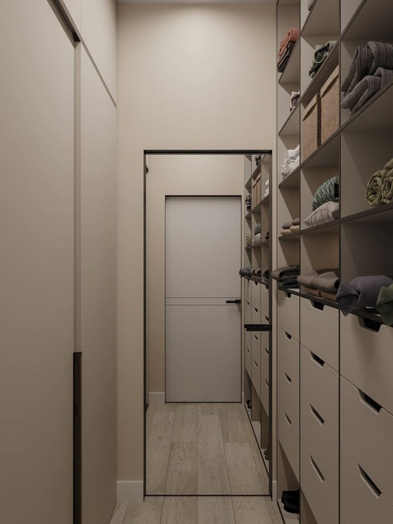 Во второй гардеробной — вытянутое помещение с симметричной системой хранения: с одной стороны — полки и ящики для одежды, с другой — высокий зеркальный фасад, визуально расширяющий пространство. Открытые полки с аккуратно сложенными вещами делают гардеробную очень функциональной и удобной для повседневного использования.