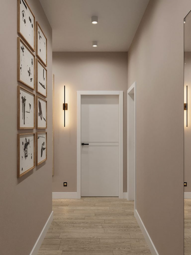 Чтобы вытянутый коридор не выглядел скучно, мы добавили декоративные бра и крупное зеркало в деревянной раме. Стены украшены абстрактными графичными рисунками — это недорогое, но эффектное решение. Напольное покрытие под тёплое дерево объединяет все зоны и добавляет уюта.