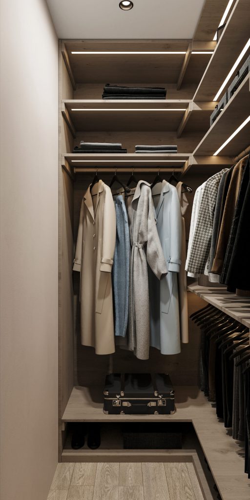 Гардеробные спроектированы так, чтобы использовать каждый сантиметр: много полок, ящиков и вешалок, продуманное освещение и зонирование. В первой гардеробной компактное и хорошо организованное пространство. Предусмотрены верхние открытые полки с подсветкой, два уровня для вешалок и нижняя зона для чемоданов и обуви. Всё выполнено из светлого дерева, что создаёт ощущение уюта и порядка.