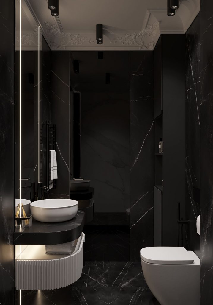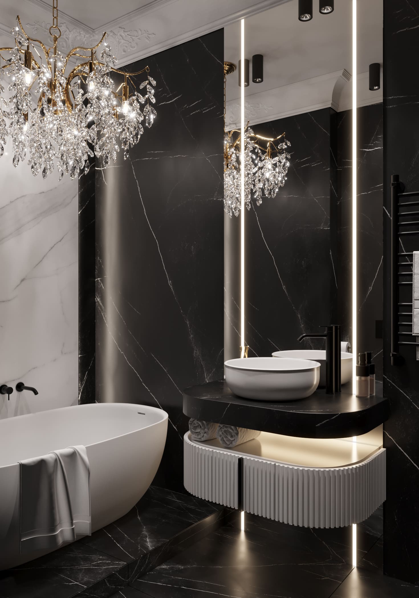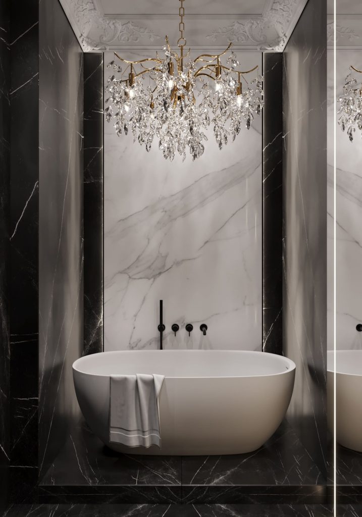 Поистине роскошно оформилен и санузел — на контрасте чёрного и белого мрамора, с продолжением художественной лепнины на потолке. Стильная белая ванна, которая стоит на чёрном мраморном полу, сразу притягивает взгляд. Над ней разместили изящную хрустальную люстру с золотыми деталями — она задает элитный стиль всему интерьеру. Умывальник установили на чёрной столешнице с подсветкой, а над ним повесили элегантное зеркало. Получилось сдержанно и очень выразительно.