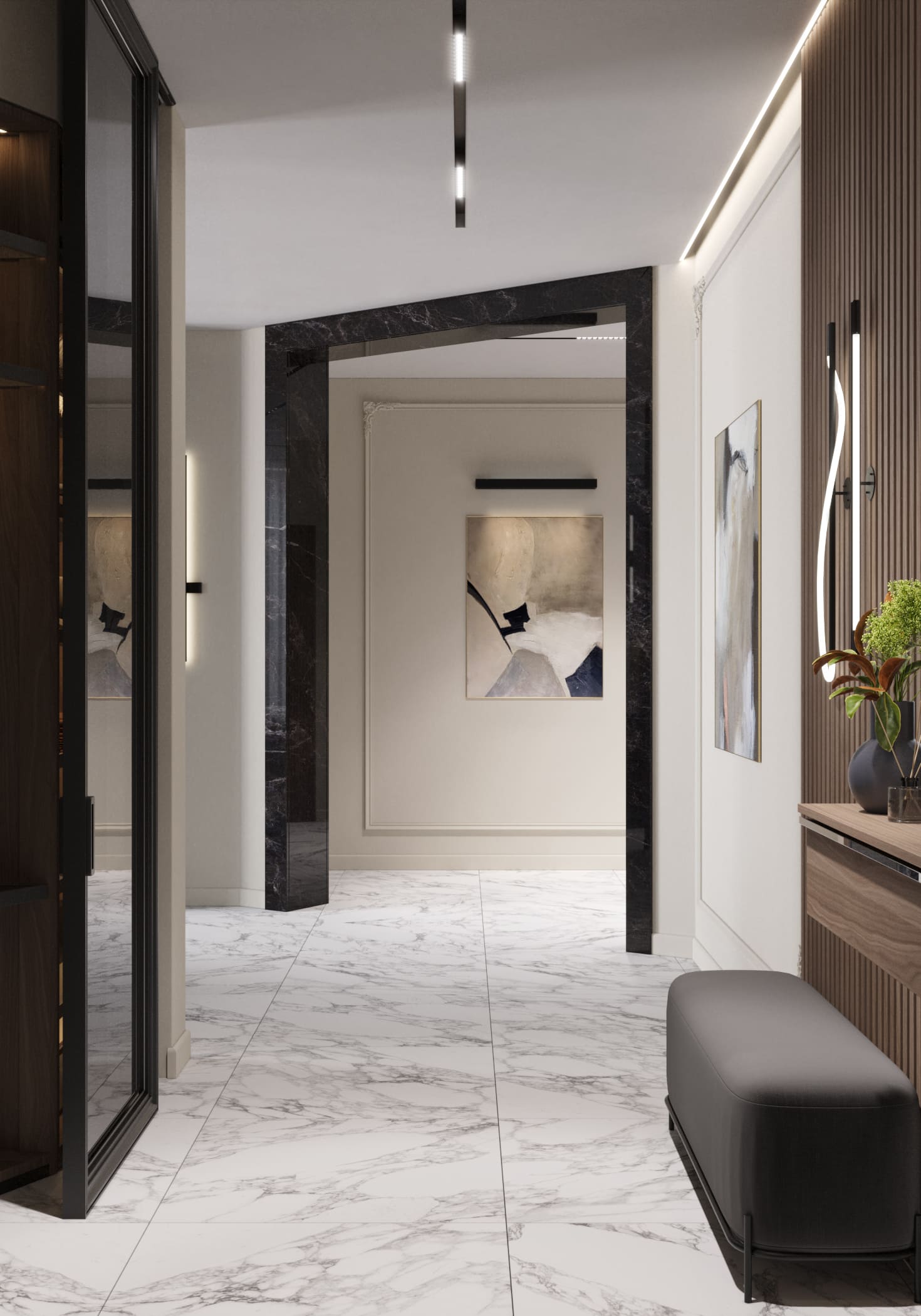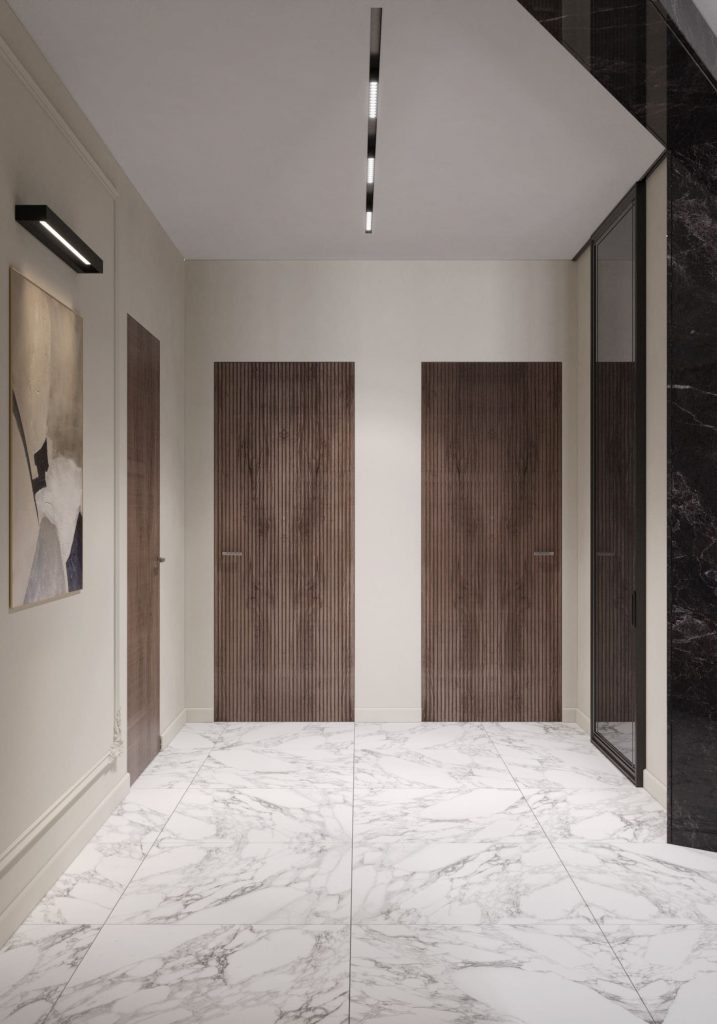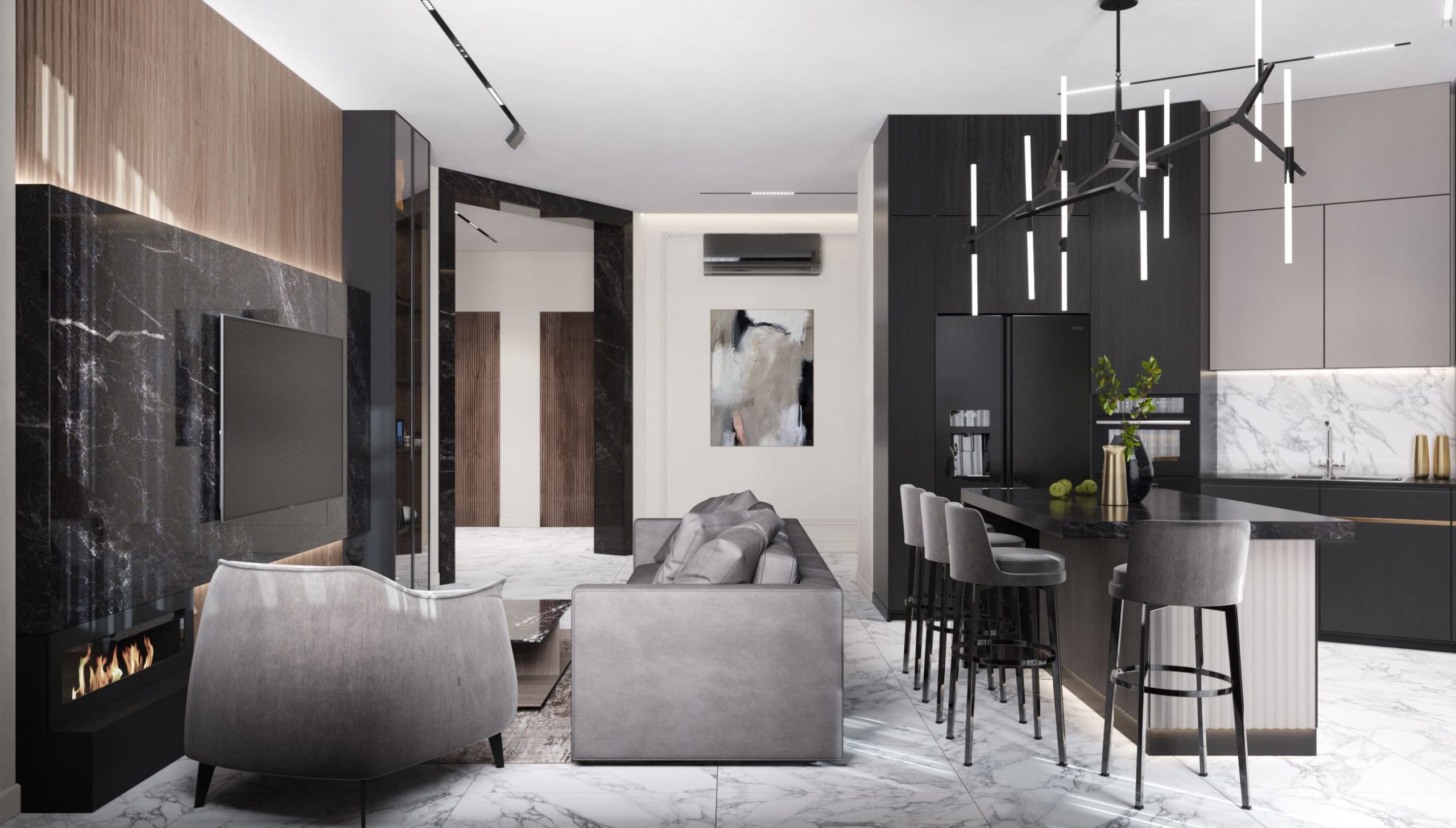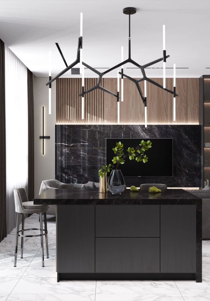 Стильная квартира с контрастной отделкой и акцентом на мрамор