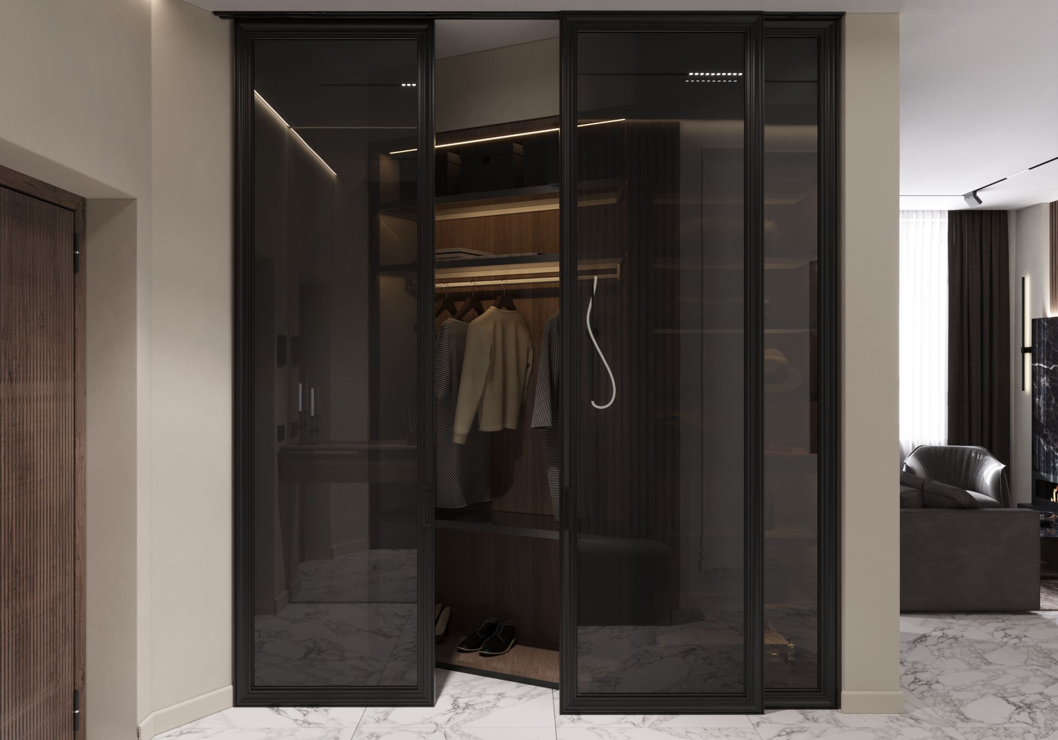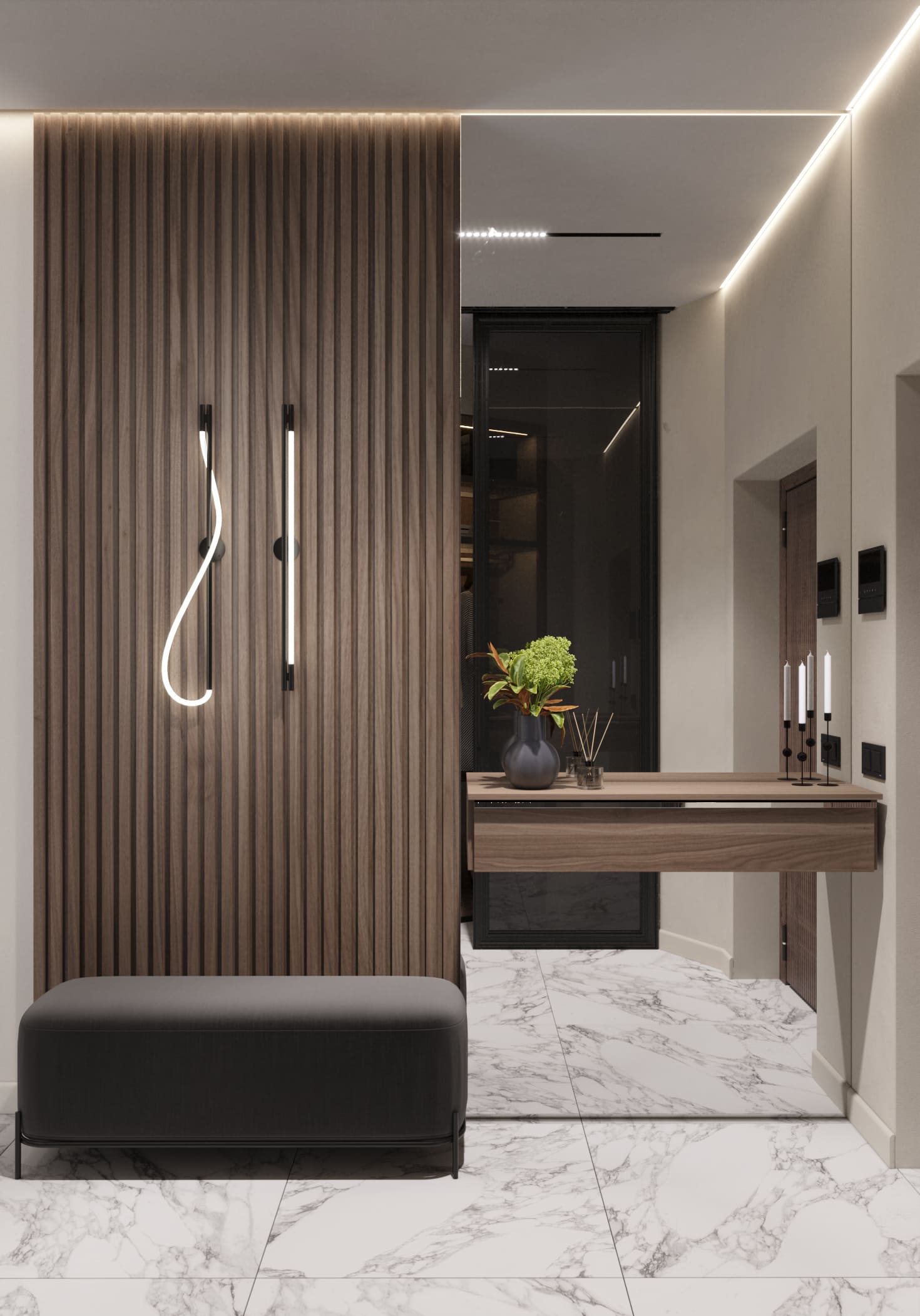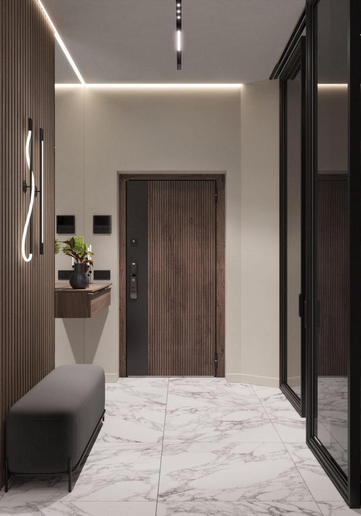 Стильная квартира с контрастной отделкой и акцентом на мрамор