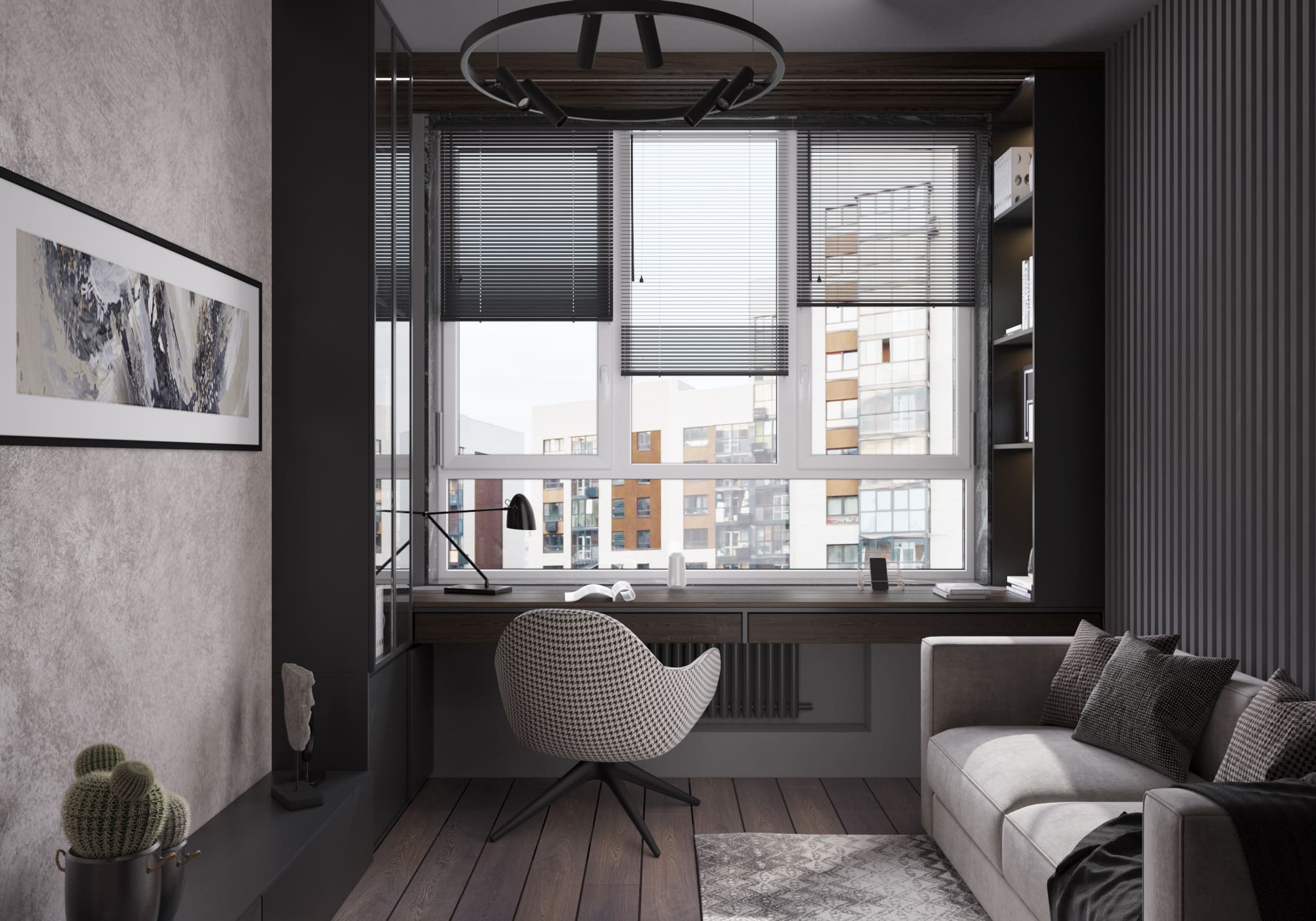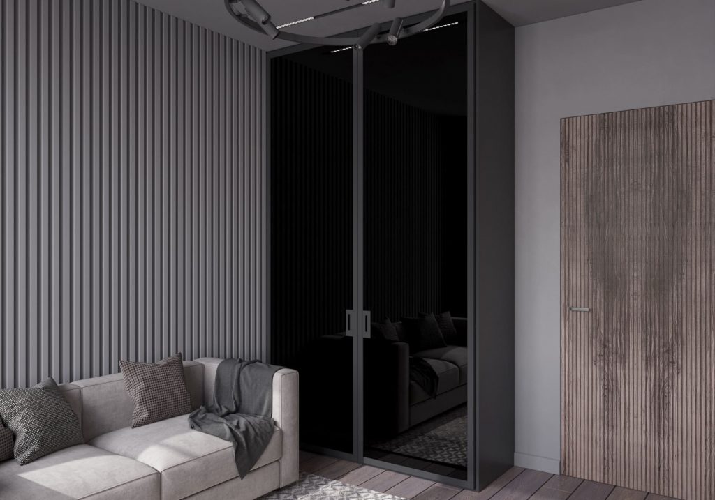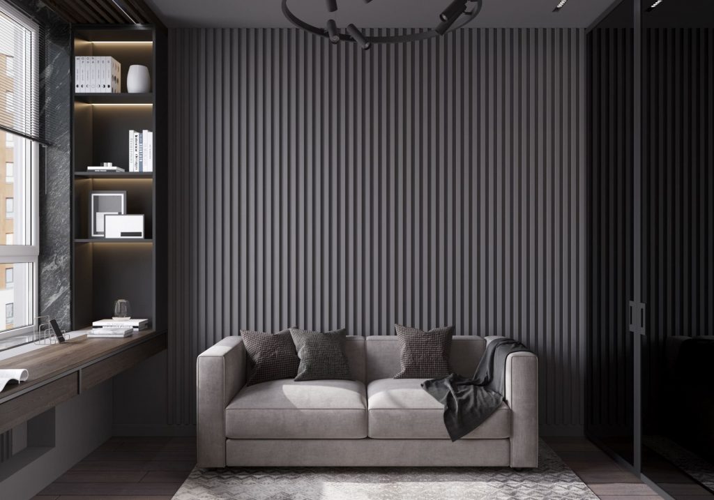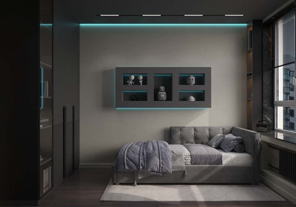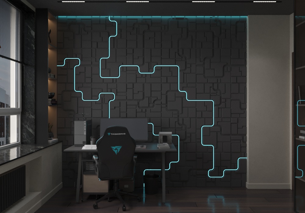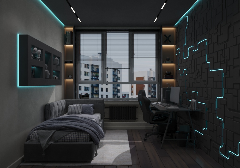 На противоположной стене разместили декоративное LED-освещение встроенное в геометричные, объёмные панели — оно задаёт футуристический настрой и позволяет менять восприятие комнаты в вечернее время. У стены — полноценный письменный стол с компьютером и эргономичным креслом. Несмотря на тёмную палитру, комната не кажется мрачной: большие окна пропускают много естественного света, который днём полностью преображает интерьер.