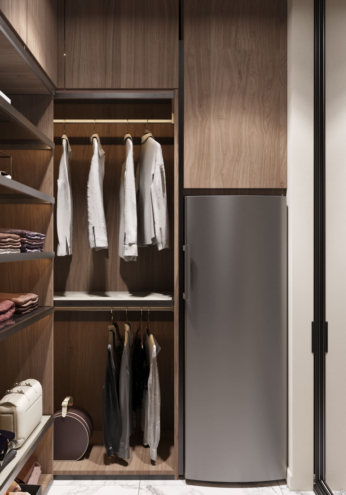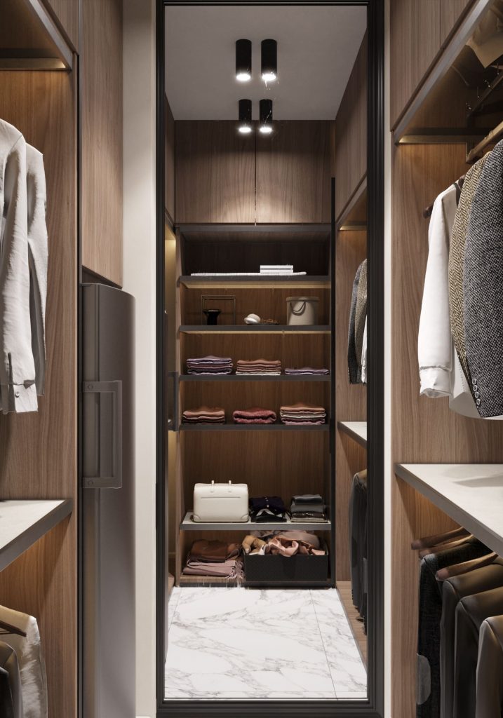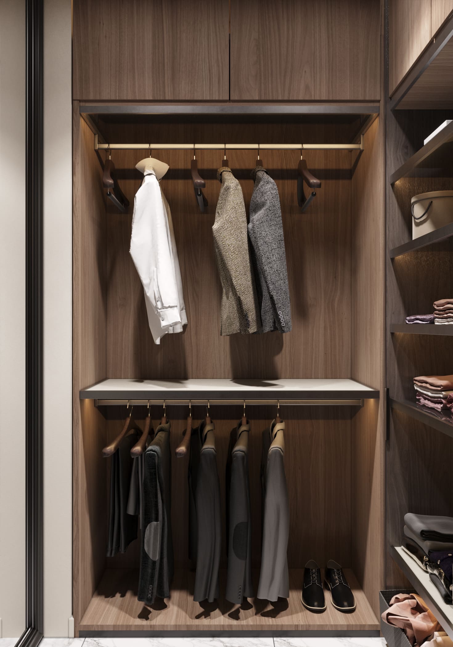 Пространство гардеробной решено в тёплых деревянных оттенках. Мы продумали систему хранения так, чтобы всё было под рукой: просторные полки, вешалки для одежды, обуви и аксессуаров — каждая вещь имеет своё место. Светлое освещение подчёркивает порядок и аккуратность, а грамотная организация пространства делает процесс поиска быстрым и комфортным.