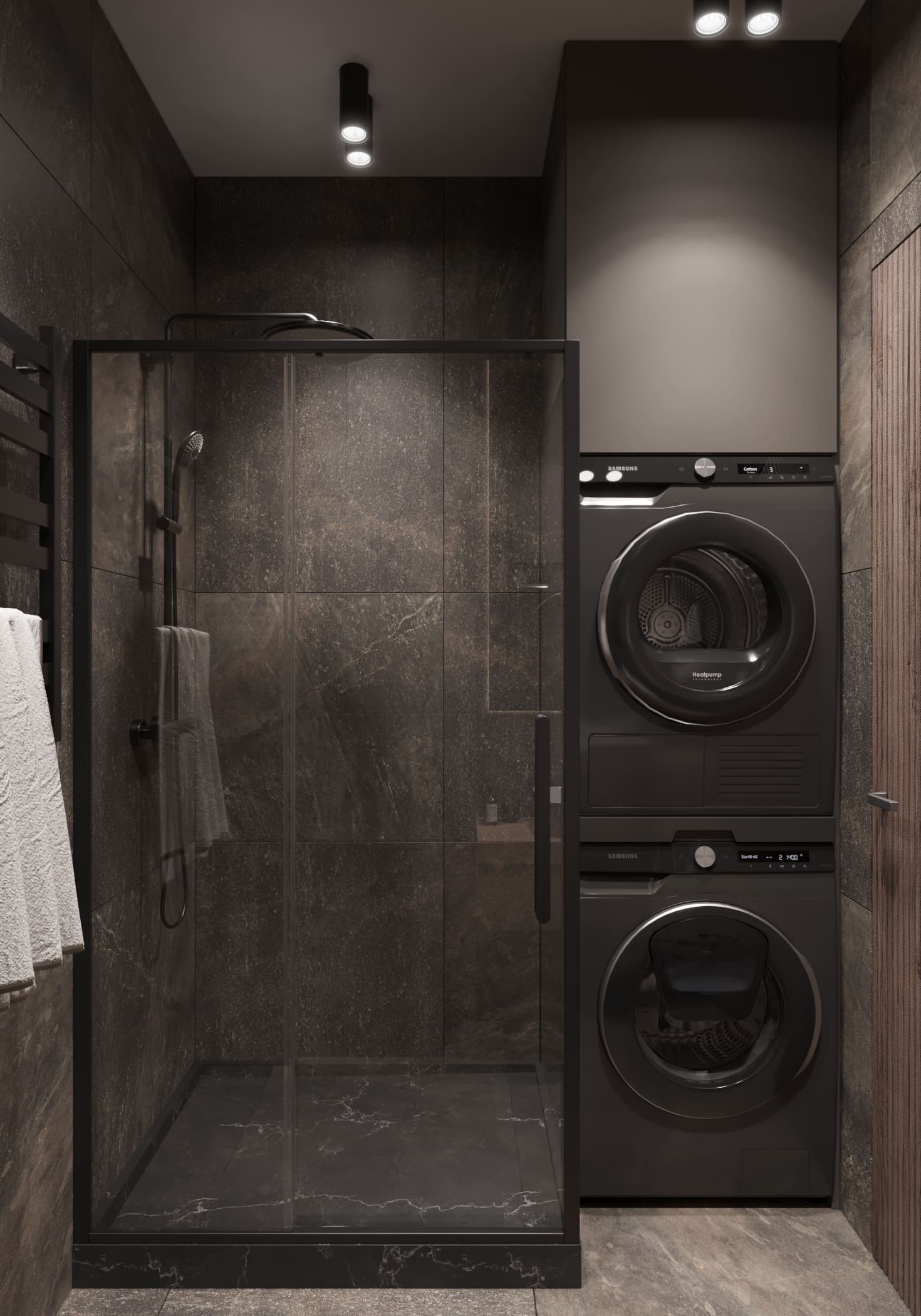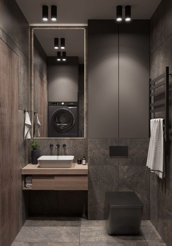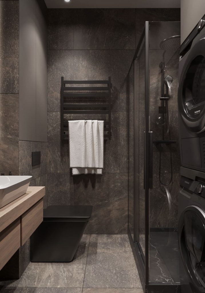 Второй санузел всё также оформлен в тёмной гамме. Центральное место заняла душевая кабина с прозрачными стеклянными стенками и современным душевым оборудованием. В одном из углов разместили навесную деревянную тумбу с раковиной, над которой установили декоративное зеркало с подсветкой — оно обеспечивает мягкий рассеянный свет, который можно усилить с помощью потолочного освещения. Рядом расположен чёрный унитаз, а стиральную и сушильную машины установили друг на друге, что позволило сэкономить место без потери удобства. Несмотря на тёмную отделку, интерьер выглядит свежо и современно за счёт продуманной компоновки и выбранных материалов.