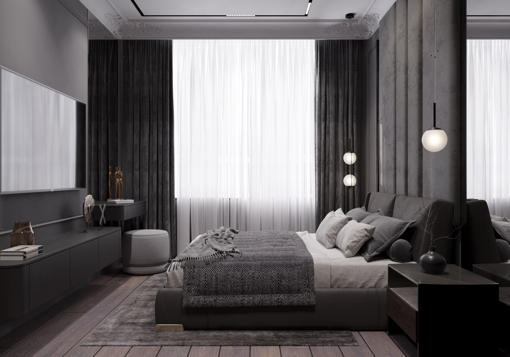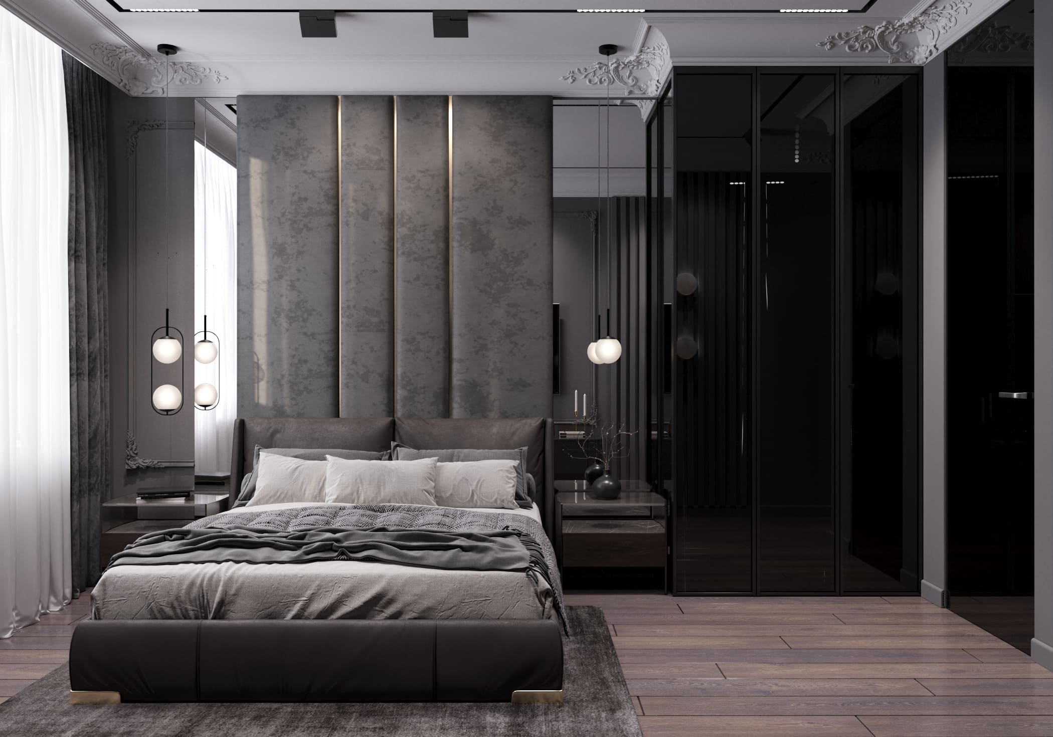 В мастер-спальне и мастер-санузле сделали акцент на изысканную роскошь и продуманные детали. Центральное место в спальне заняла кровать с мягким серым изголовьем, а за ней расположили мягкие стеновые панели, которые добавляют визуального комфорта. По бокам кровати поставили прикроватные тумбы, за каждой из которых разместили высокие зеркала — они работают на расширение пространства и создают симметрию. Освещение организовали с помощью светильников и бра круглой формы, таким образом разбавив прямые линии.
