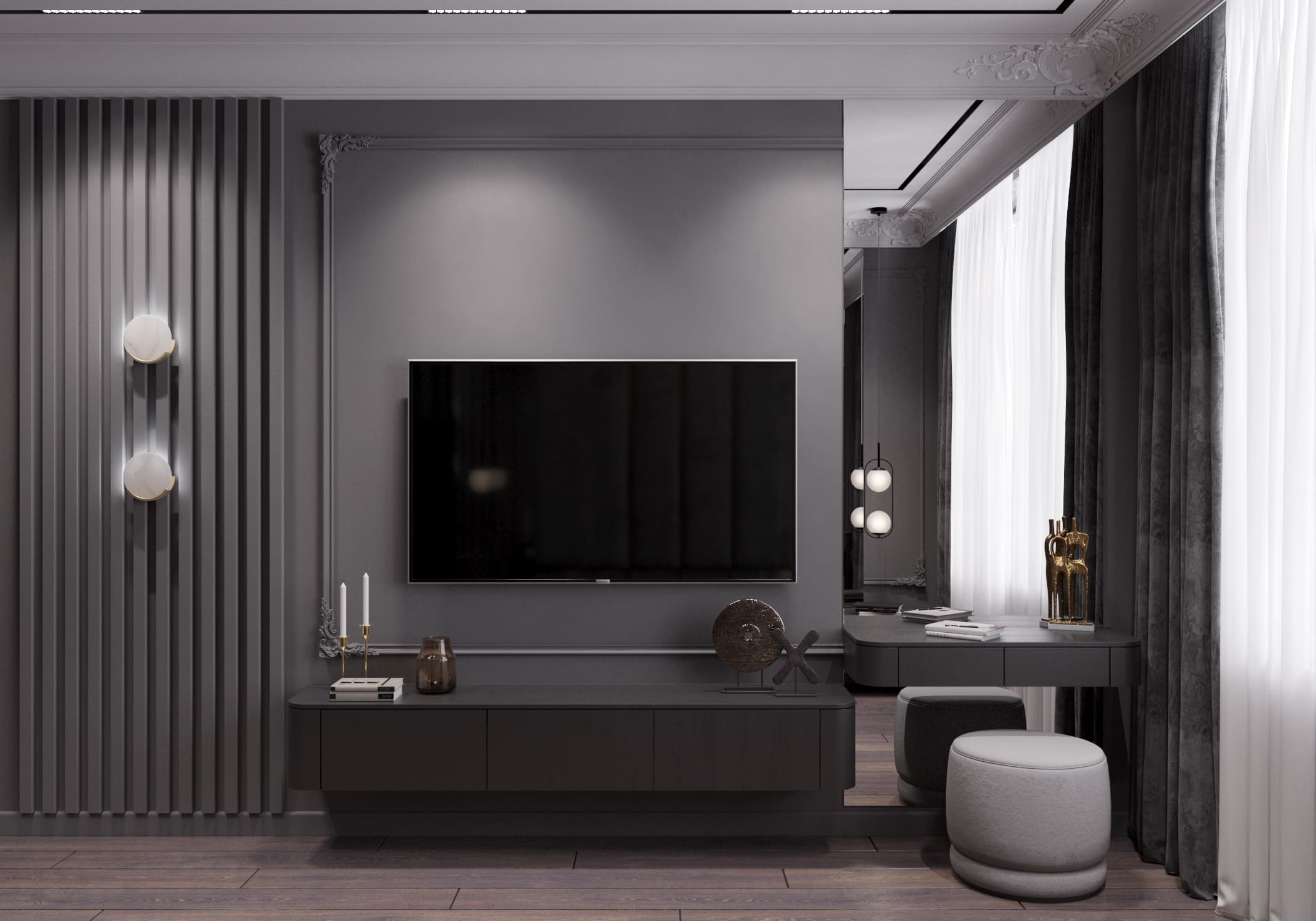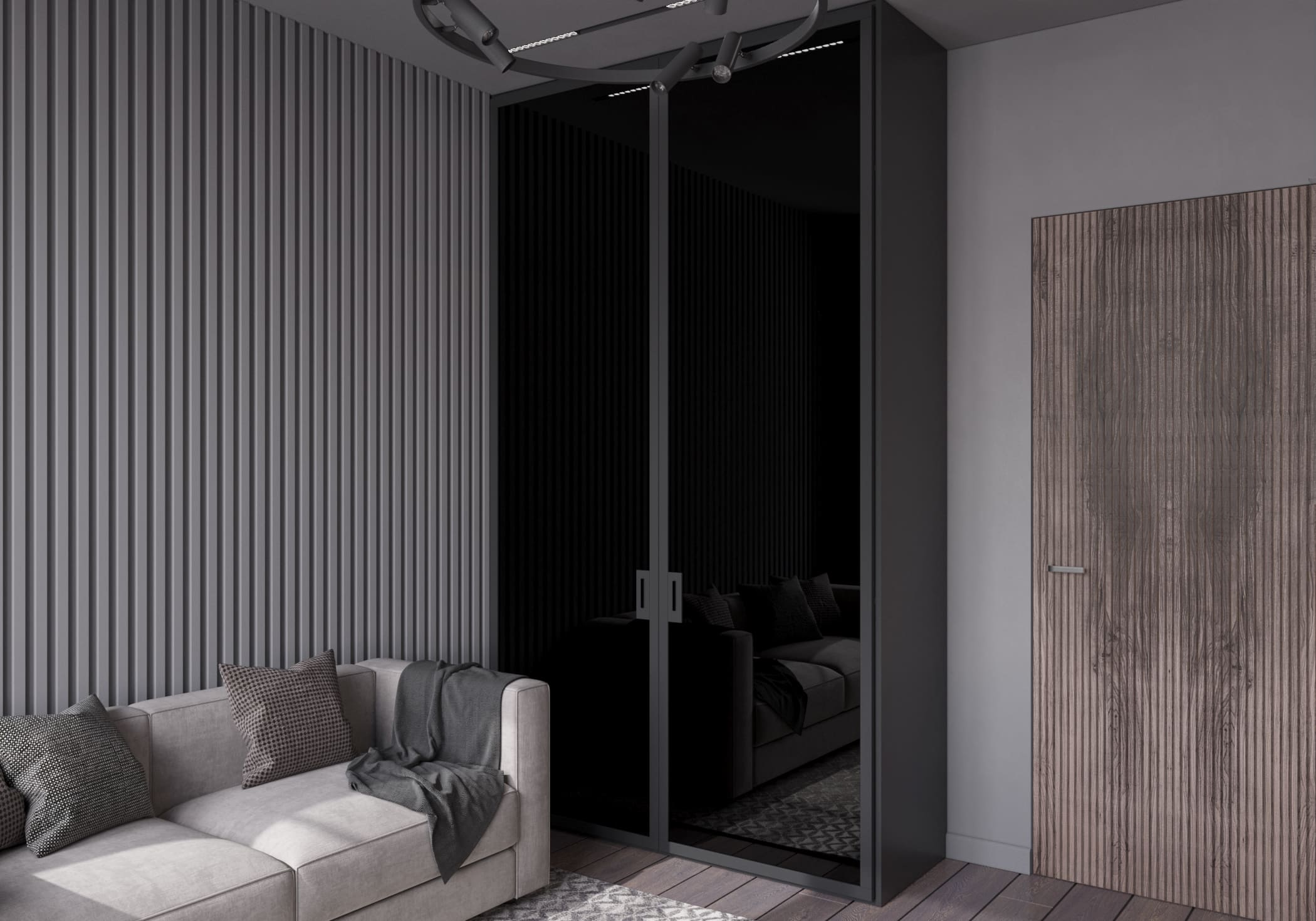 Справа разместили мягкий диван, а за ним установили стильную стеновую панель с вертикальными рельефами, которая добавляет пространству графичности. Также рядом с диваном расположили высокий шкаф с тёмными стеклянными дверцами — он гармонично дополняет композицию. и перекликается с остальными шкафами в квартире. Графичность прямых линий разбавляет стильная современная люстра в виде круга. Предусмотрено несколько сценариев освещения.