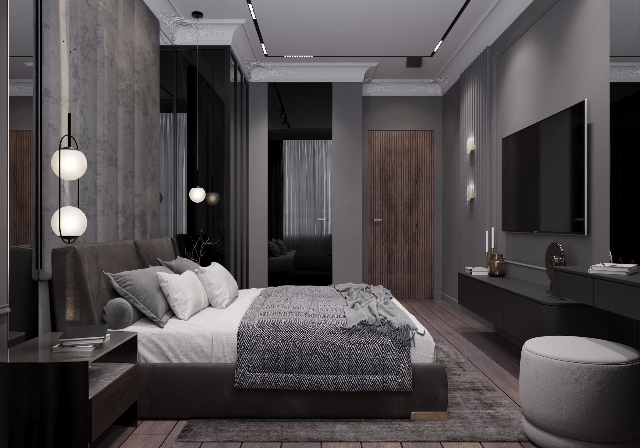 В углу комнаты установили шкаф с тонированными стеклянными дверцами, а рядом за тёмной стеклянной дверью расположился санузел — получилось функционально и эстетично. Завершающим украшением интерьера спальни является утонченная благородная лепнина, придающая пространству особую роскошь.
